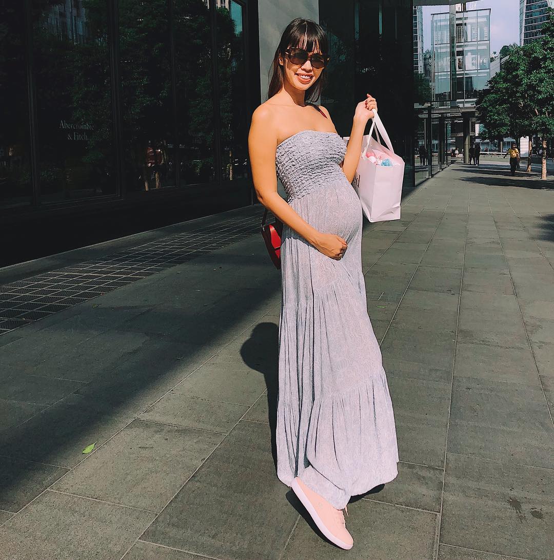 Đang ở Singapore, Hà Anh lựa chọn váy xòe dàng maxi giúp tạo sự thoải mái cho “mẹ bầu”, vừa khoe được chiều cao của người mặc.