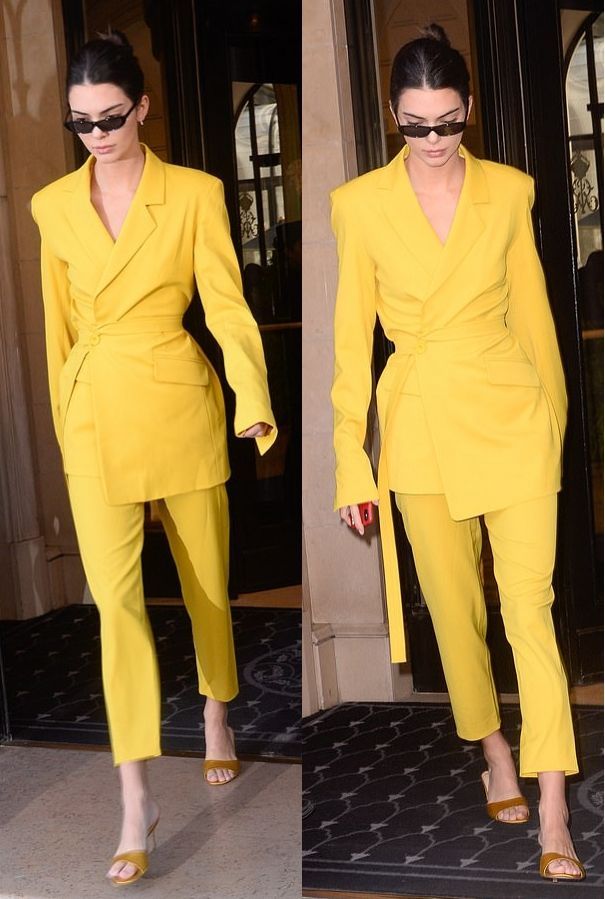 Chân dài đứng đầu bảng xếp hạng có thu nhập cao nhất thế giới Kendall Jenner trong bộ suit vàng mustard cách tân tại đường phố Paris hồi tháng 9 vừa qua.