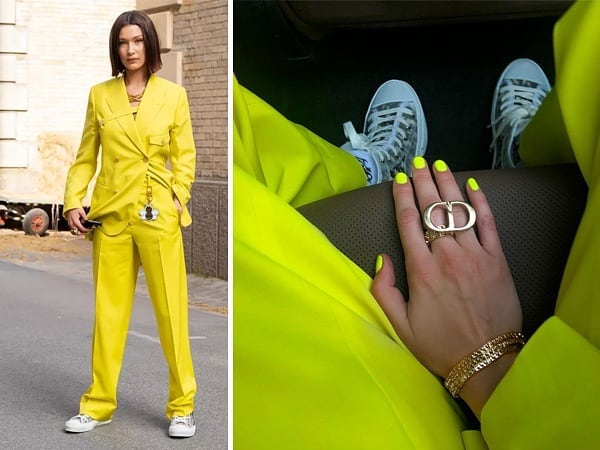 Không những trang phục đã chói lóa mà ngay cả màu móng tay của Bella Hadid cũng ăn rơ theo trang phục.