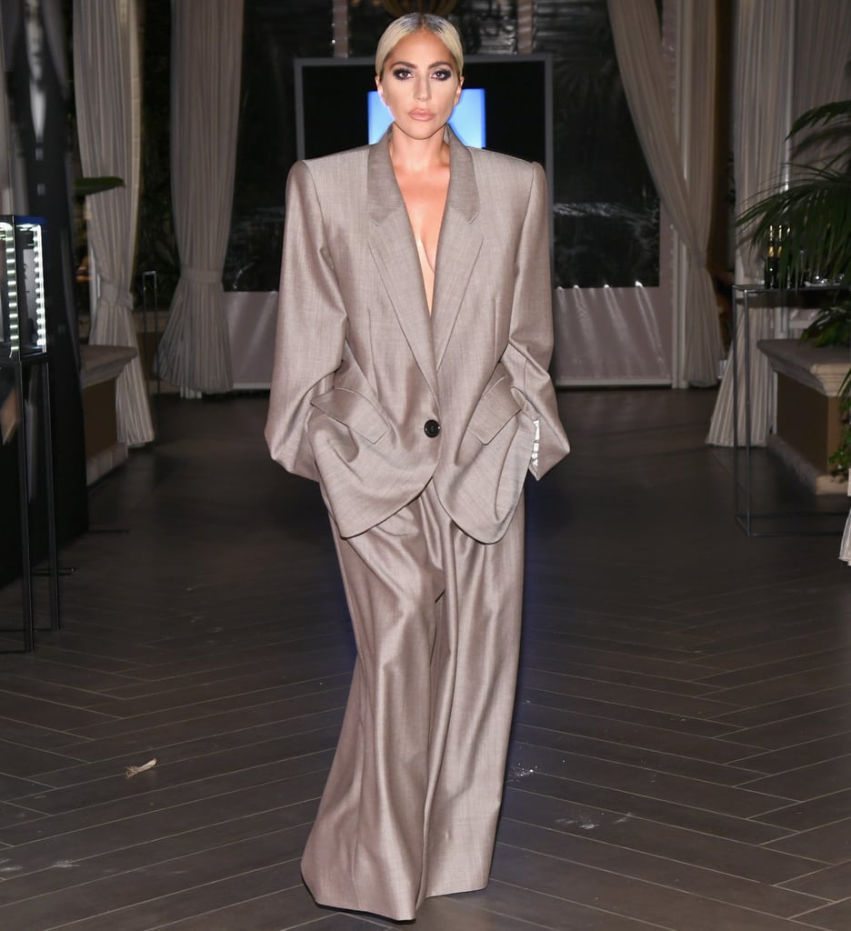 Tại một sự kiện thời trang, Lady Gaga xuất hiện trong bộ vest oversized màu xám với chất liệu bóng của nhà mốt Marc Jacobs