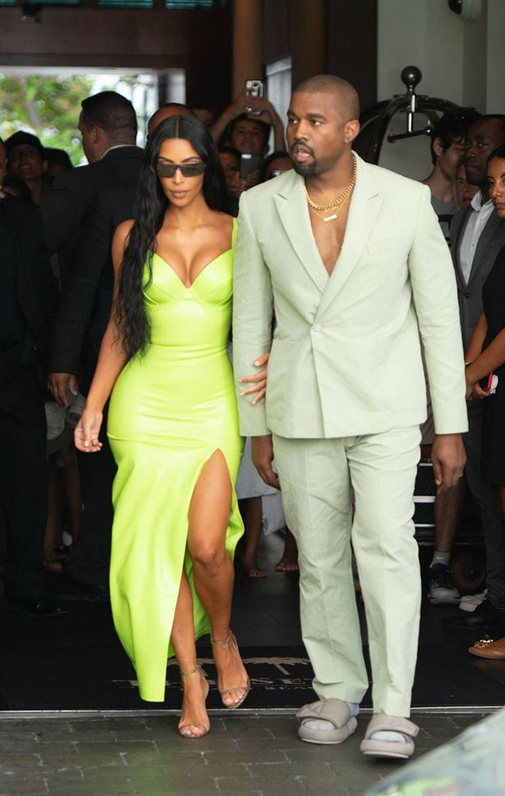 Trong lần tham dự tiệc cưới cùng rapper Kanye West, Kim Kardashian chọn một thiết kế sang trọng và gợi cảm có màu xanh pha chút vàng xanh neon rực rỡ.