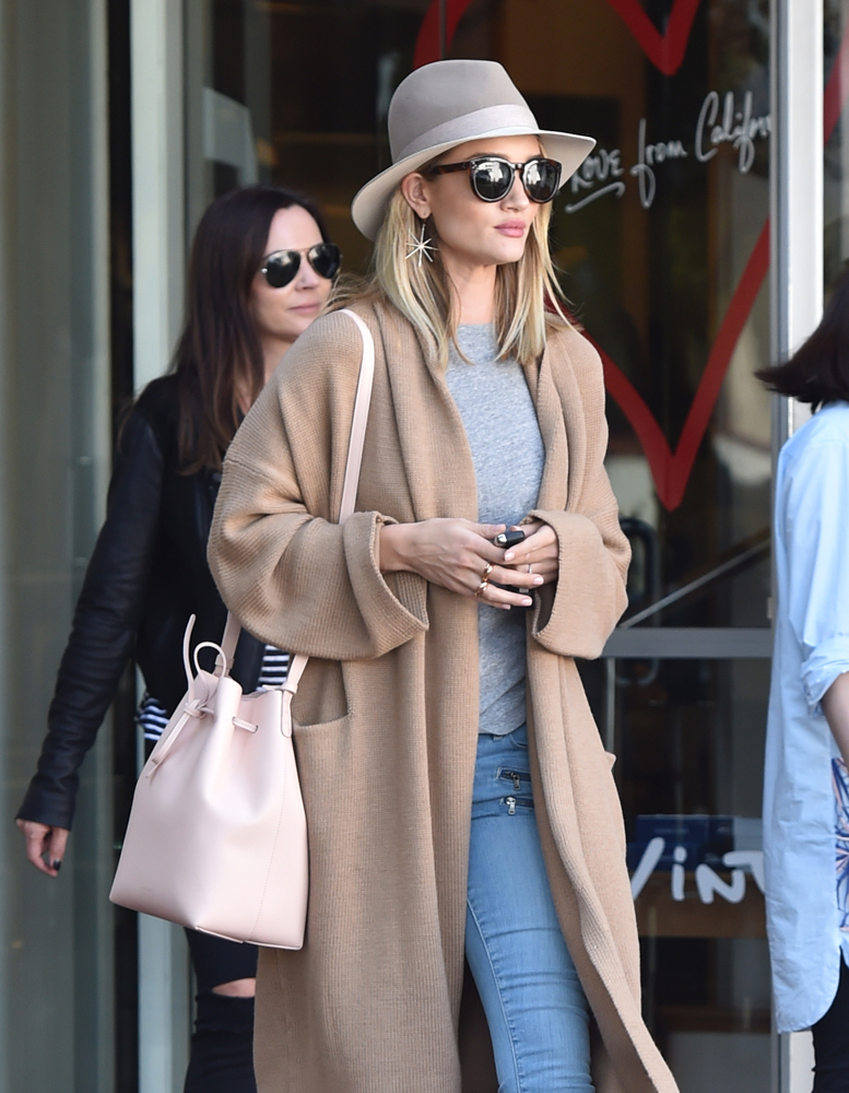 Rosie Huntington dạo phố với trang phục áo khoác dáng dài, mũ vành fedora và chiếc túi xô mini màu pastel rất ăn nhập với trang phục .