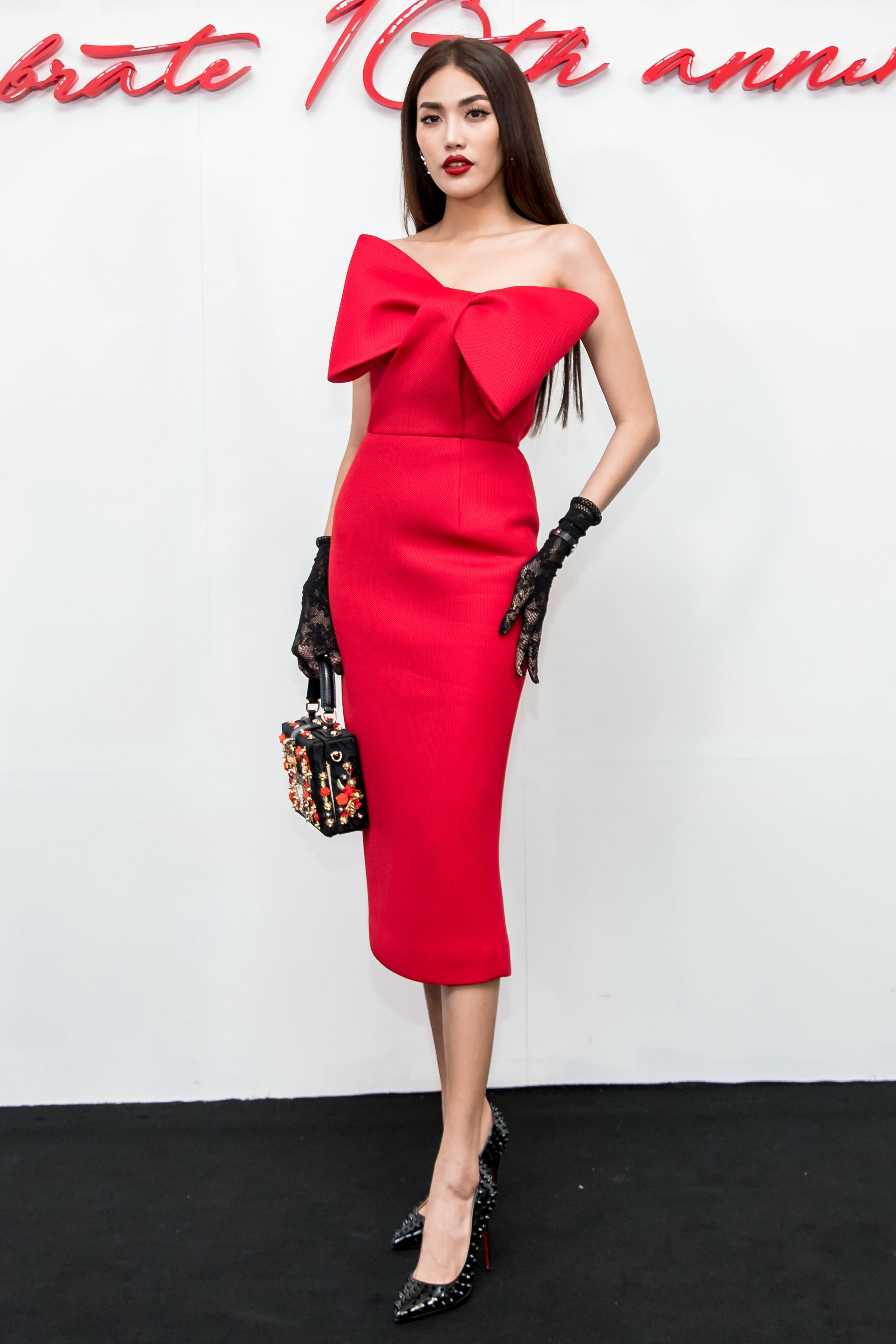 Lan Khuê nhận được điểm 10 từ fan khi đem đến ánh nhìn cổ điển trong mẫu váy nơ tạo khối 3D. Túi xách, giày, gang tay được chọn tinh tế giúp cô được khen ngợi hết lời.