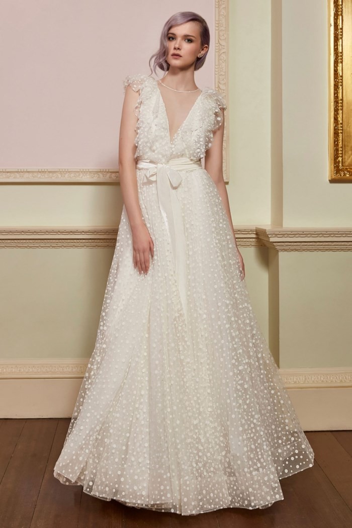 Chung Hân Đồng lựa chọn váy cưới có điểm xếp bèo nữ tính, cổ khoét sâu hun hút vô cùng gợi cảm. Mẫu thiết kế này nằm trong BST Thu Đông 2018 của Jenny Packham.