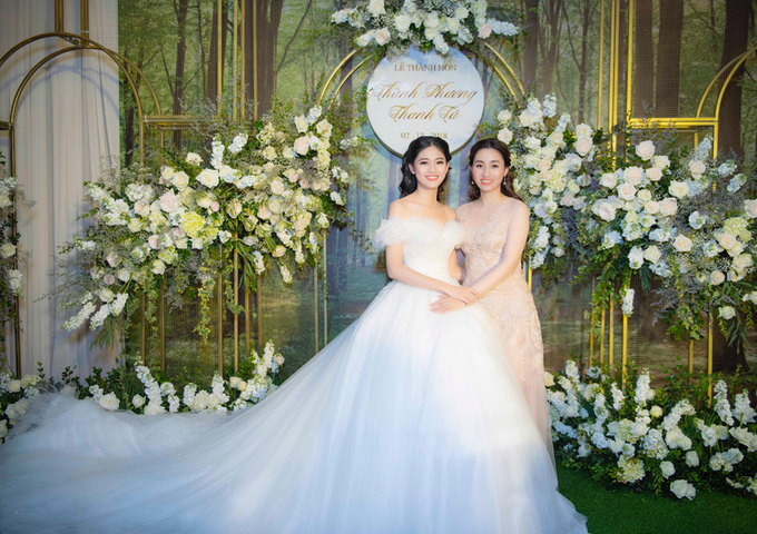 Á hậu Thanh Tú tỏa sáng trong mẫu váy lấy cảm hứng từ nàng Lọ Lem Cinderella. Váy cưới của cô dâu có chiều cao khủng này được thiết kế và hoàn thiện trong 3 tháng. Váy được may từ 300 mét vải, thân váy được đính 10.000 viên pha lê Swarovski.
