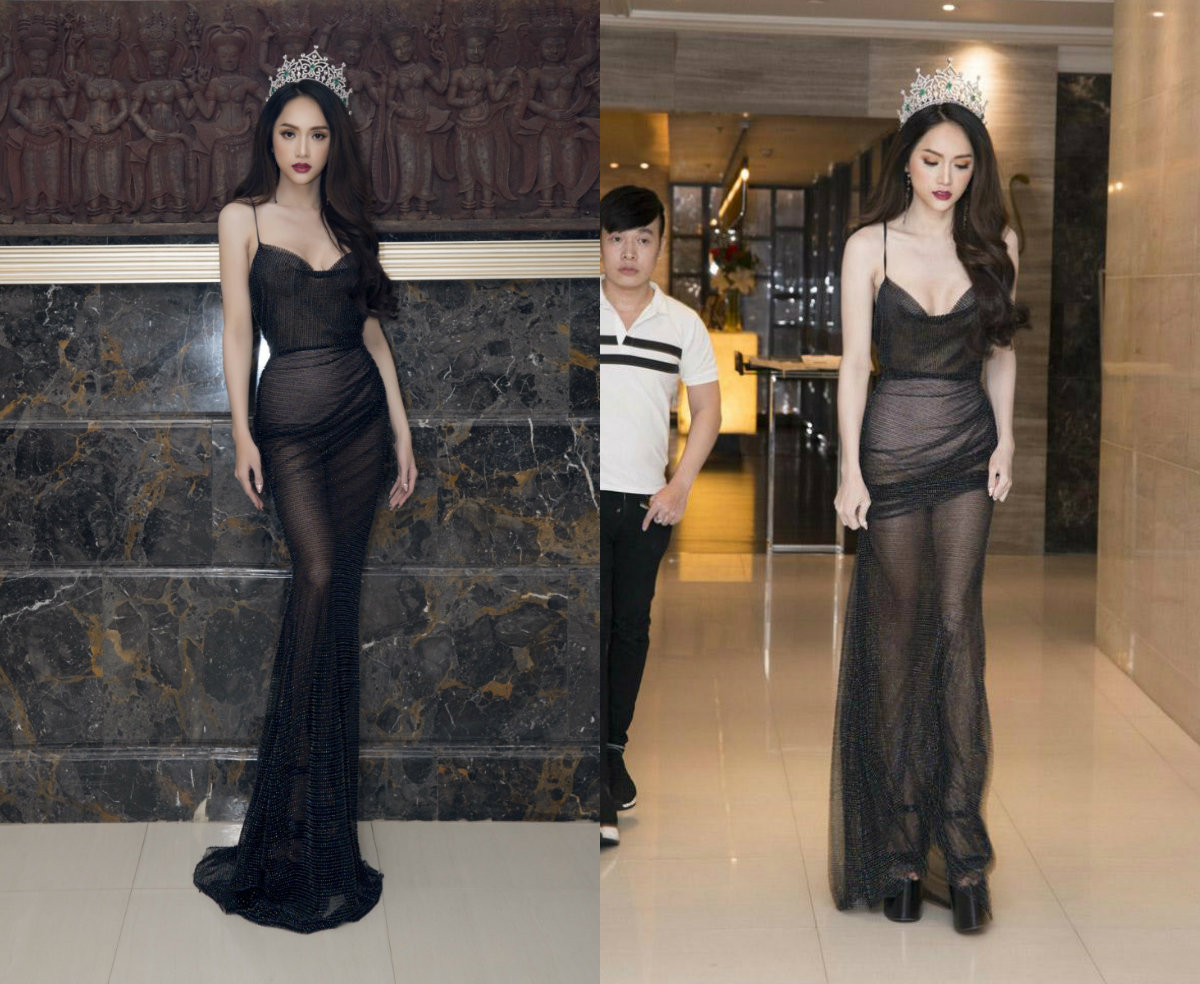 Dẫn đầu trong top mỹ nhân ăn mặc hở bạo chính là Hoa hậu Hương Giang. Xuất hiện tại sự kiện xứ sở Chùa vàng, mỹ nhân chuyển giới “cả gan” diện một thiết kế không thể nào mỏng hơn được nữa. Vì chất liệu mỏng như sương, vô tình Hương Giang để lộ miếng dán ngực khiến fan hâm mộ không ngừng lo lắng vì có thể xảy ra sự cố bất cứ lúc nào.