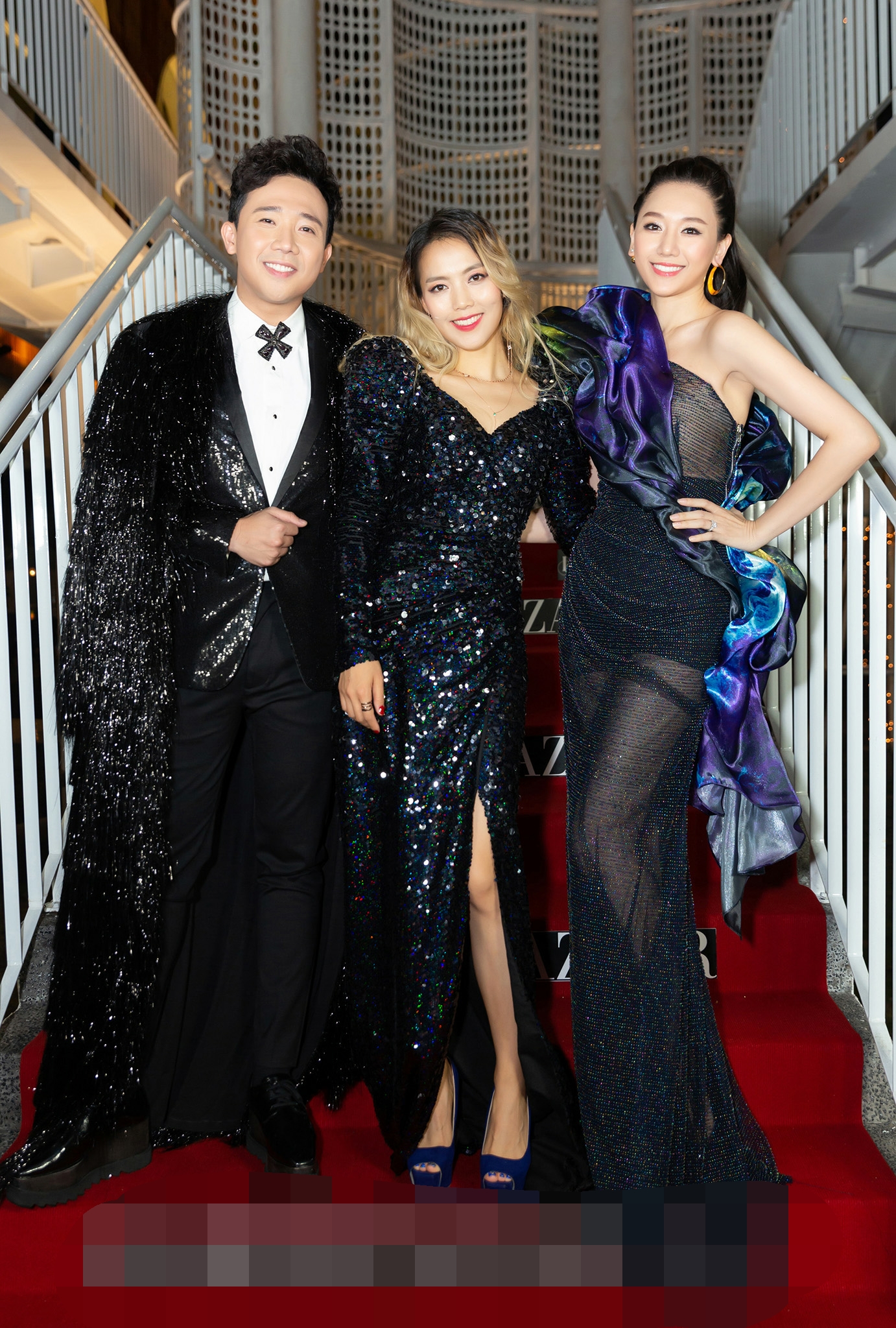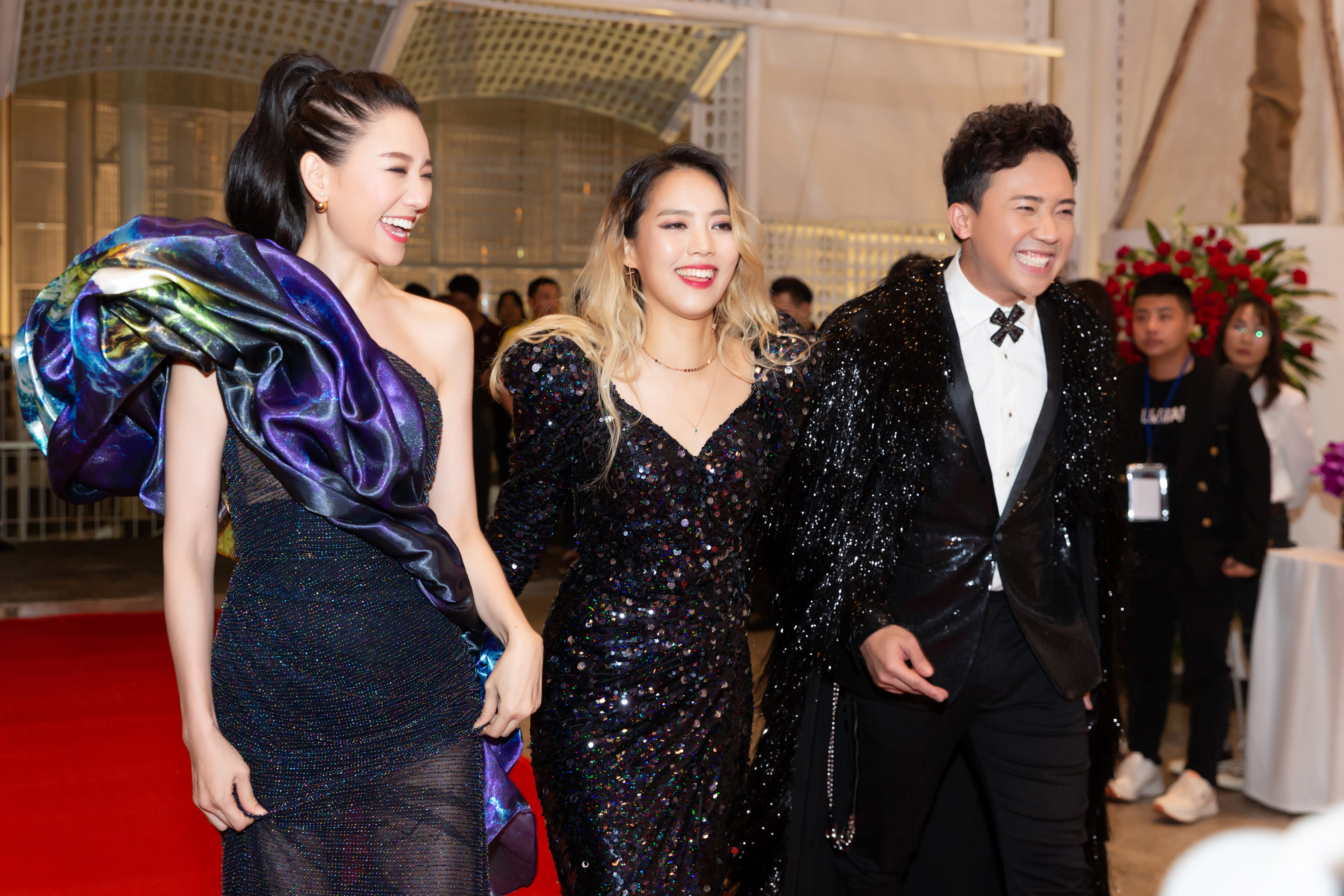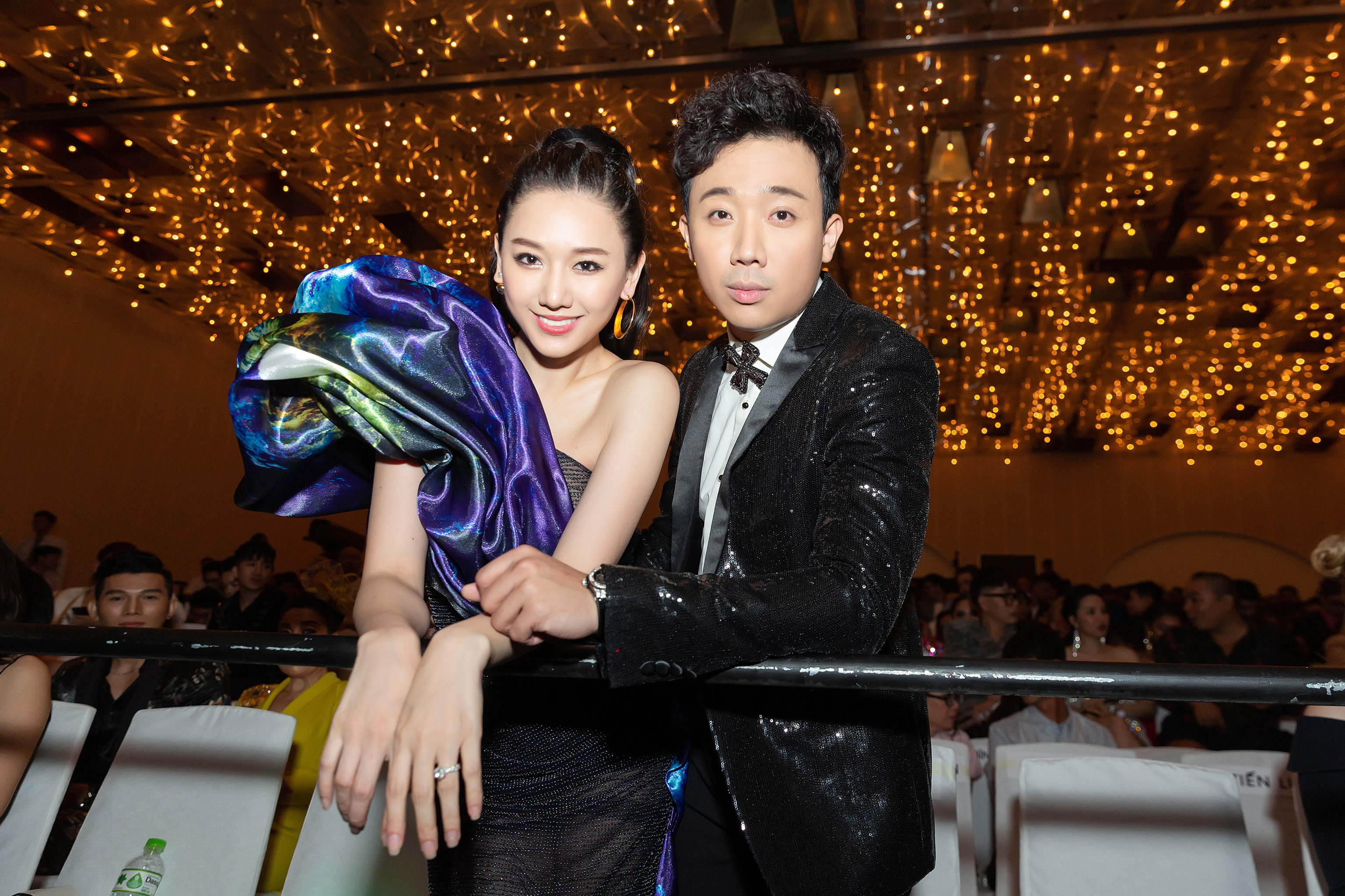 Trên thảm đỏ, cặp đôi diện trang phục đồng điệu với hình ảnh cầu kỳ gây sự chú ý đặc biệt từ truyền thông và các khán giả có mặt. Theo đó, nếu Trấn Thành lạ lẫm cùng bộ vest đen cách điệu với chi tiết áo choàng tua rua thì Hari Won như hóa “nữ thần” với bộ váy mang gam màu galaxy lạ mắt.