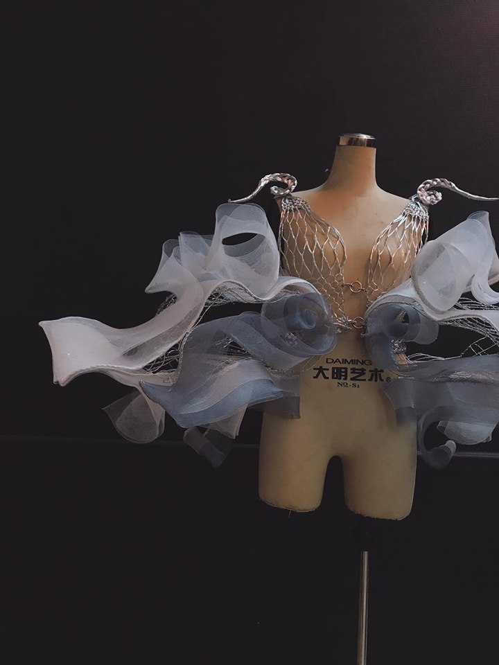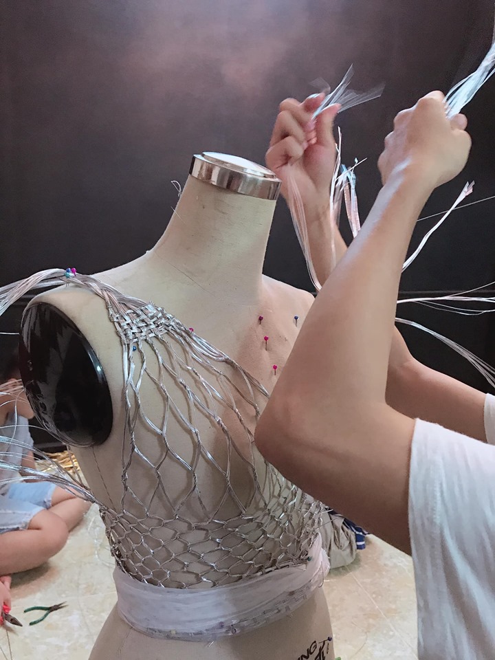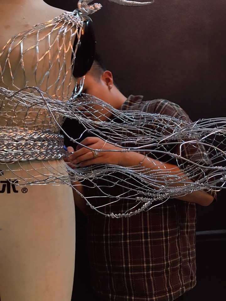 Ngoài kẽm, trang phục còn được đính đá pha lê Swarovski lấp lánh và một số chất liệu vải khác.