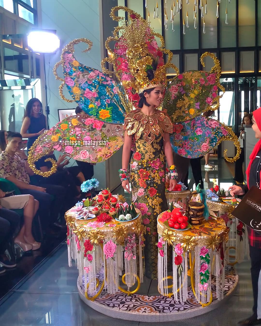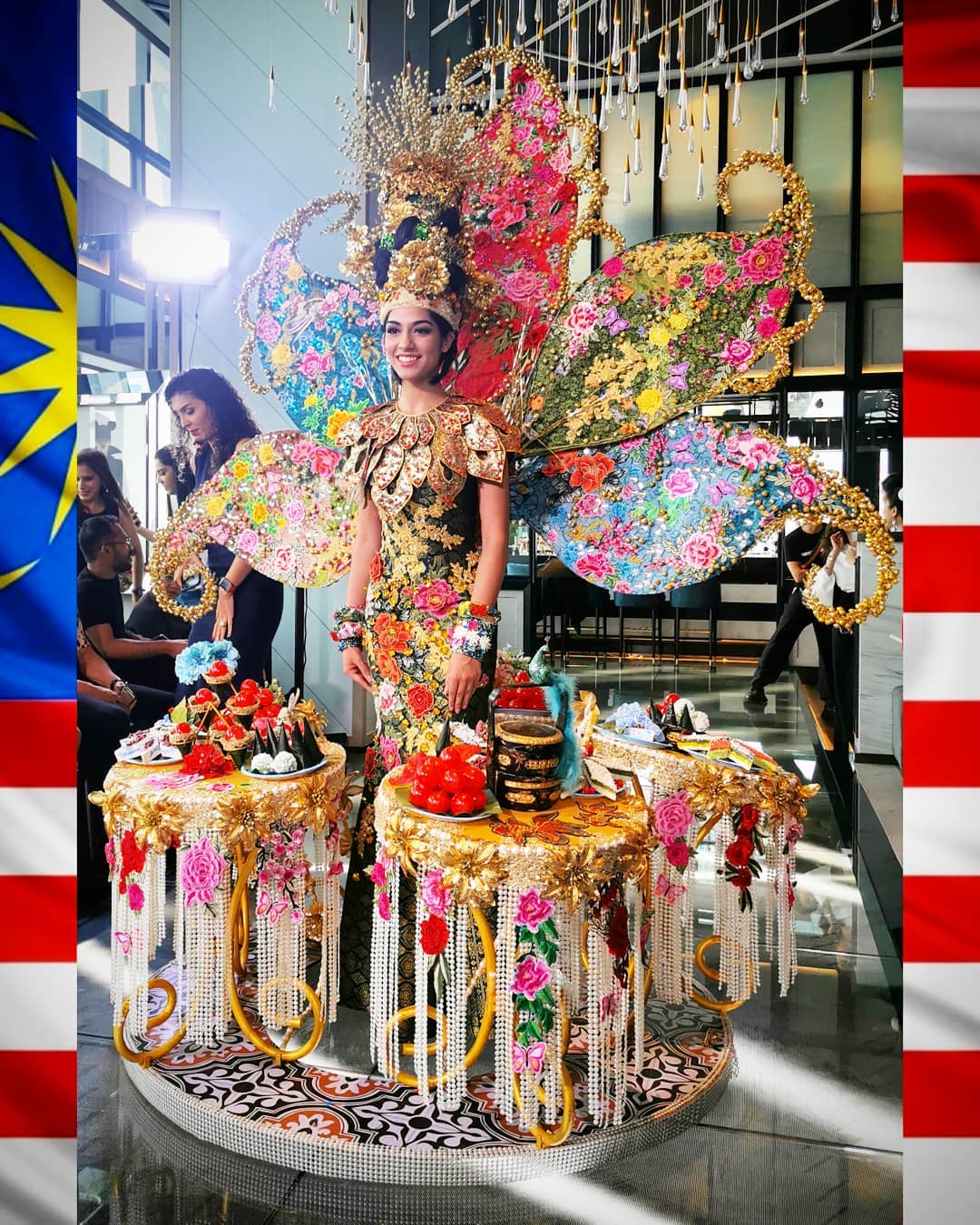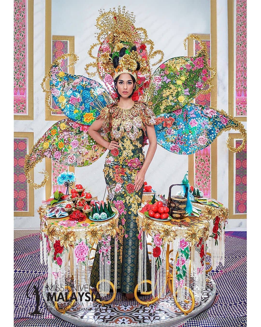 Điểm ấn tượng đầu tiên của mẫu trang phục của Malaysia đó chính là lối phối màu sặc sỡ, bắt mắt dễ thu hút người nhìn. Tiếp theo đó là hai bàn cỗ khiến nhiều người liên tưởng tới bộ trang phục “Bàn Thờ” của Hoàng Thùy.