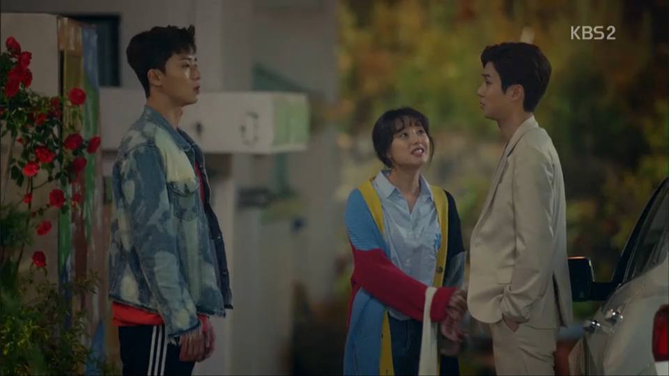 Kể cả khi đứng đối diện với tình địch, anh chàng không vì bộ đồ tưởng chừng như xuề xòa của mình mà lép vế trước bộ suit bảnh bao.