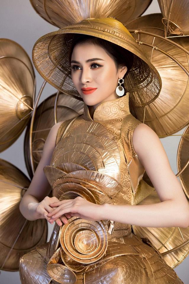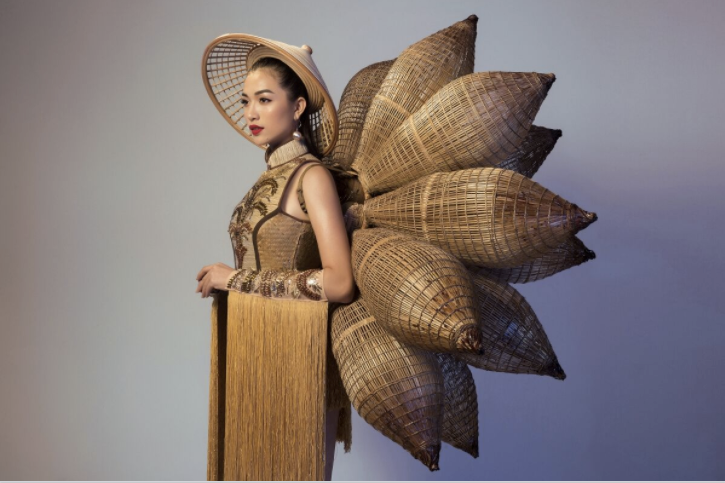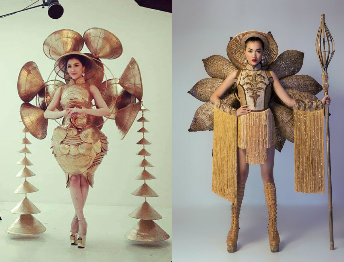Hai bộ Quốc phục đều có sử dụng chất liệu tre nứa với hình ảnh chiếc nón lá làm chủ đạo.