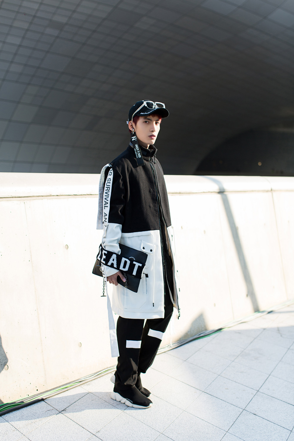 Chọn 2 gam màu đen - trắng kinh điển làm chủ đạo, stylist Kye Nguyễn thể hiện sự sáng tạo, phóng khoáng và phá cách với set đồ của NTK Võ Ngọc. Anh chàng còn kết hợp cùng đôi sneaker đình đám của Balenciaga.
