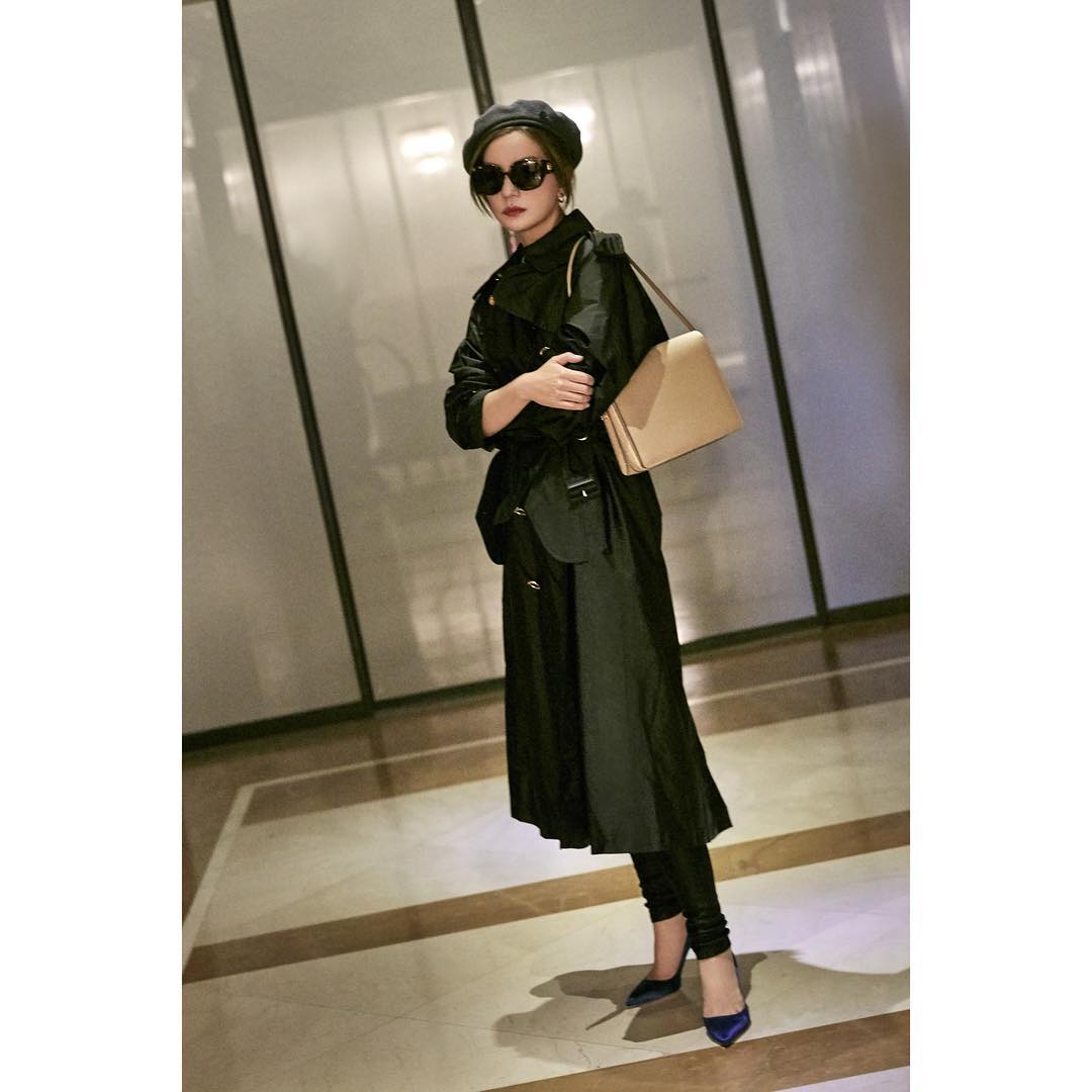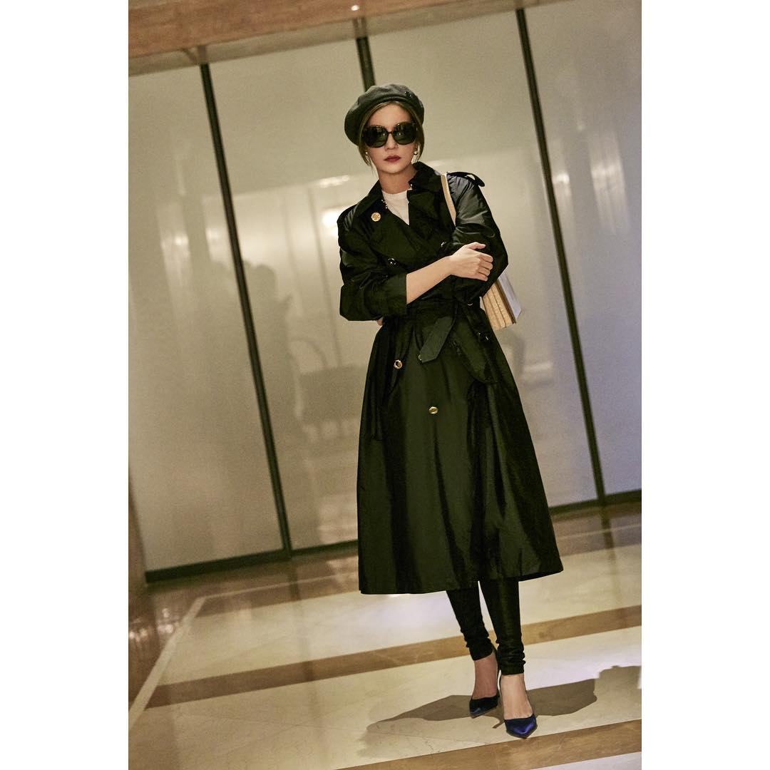 Triệu Vy trong trang phục của thương hiệu Burberry trước đó với áo khoác dáng dài màu xanh “quân đội” lạnh lùng và hợp thời trang