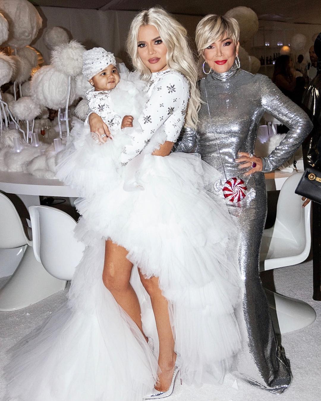 Cô chị Khloe Kardashian trong chiếc váy trắng xếp ly tầng xòe như một chiếc váy công chúa chụp hình bên cạnh con gái và người mẹ của mình