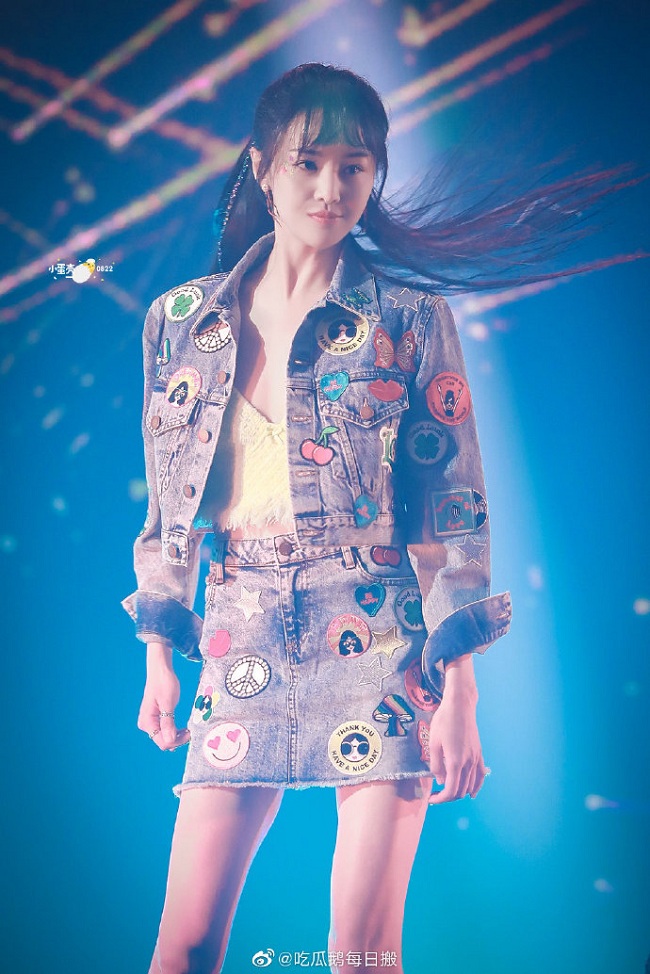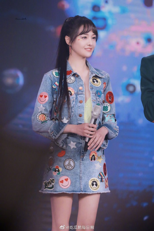 Set đồ đầu tiên tại tiệc sinh nhật của mình , Trịnh Sảng chọn combo denim từ áo khoác đến váy ngắn có in hình hoạt tiết nhí nhảnh, đáng yêu