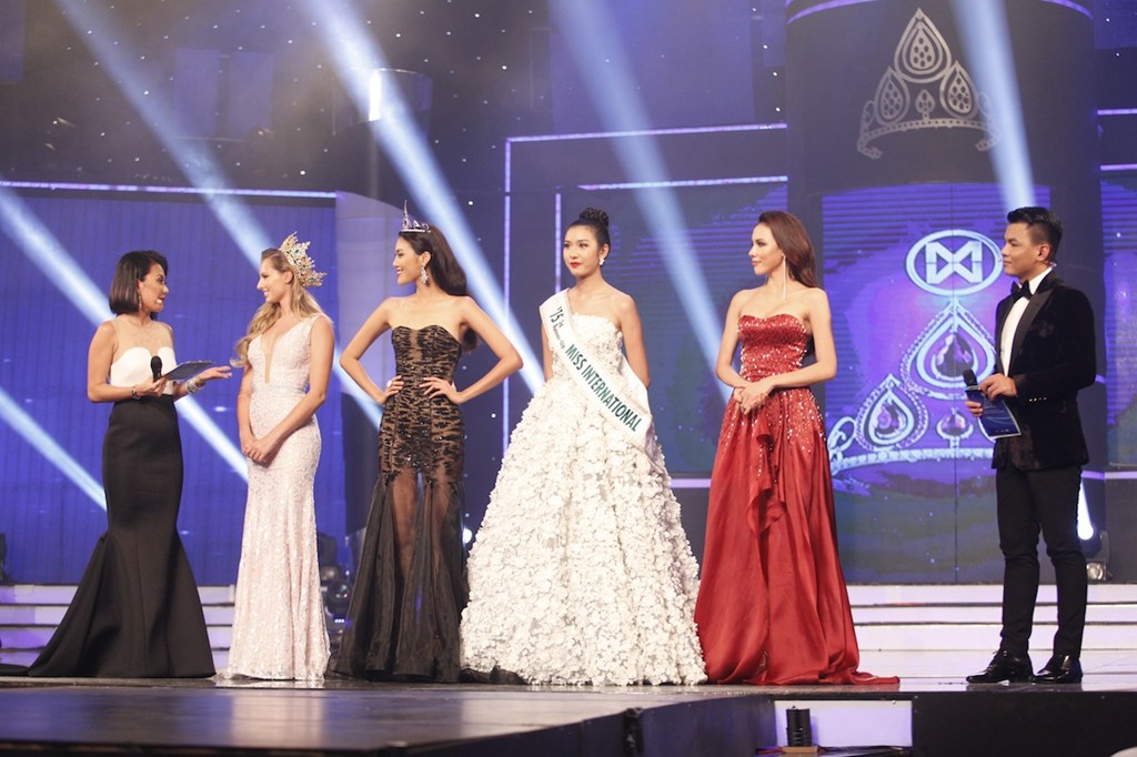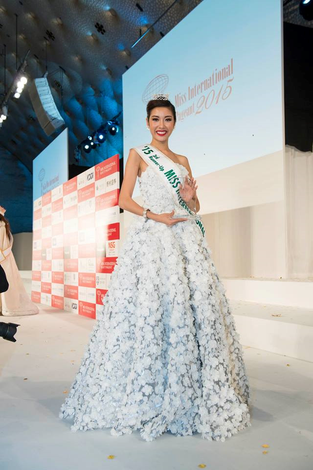 Á hậu Thúy Vân nổi bật với đầm dạ hội lấy cảm hứng từ hoa anh đào được cô diện trong đêm chung kết Miss International 2015 tại Nhật Bản. Chiếc váy đã góp phần vào thành tích Á hậu 3 chung cuộc.