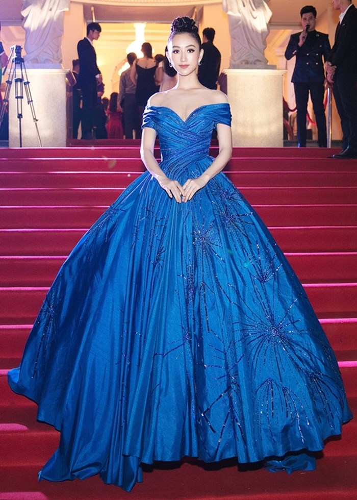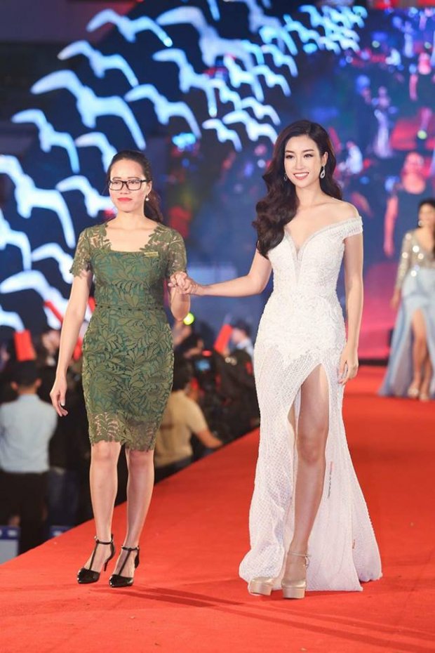Cũng trên thảm đỏ chung với Huyền My, Hoa hậu Đỗ Mỹ Linh diện lại một thiết kế từng đồng hành với người đẹp trong cuộc thi Miss World 2017. Đây là một trong 4 bộ váy dạ hội được nhà tạo mốt Lê Thanh Hòa thiết kế riêng cho Mỹ Linh để mang chuông đánh xứ người.