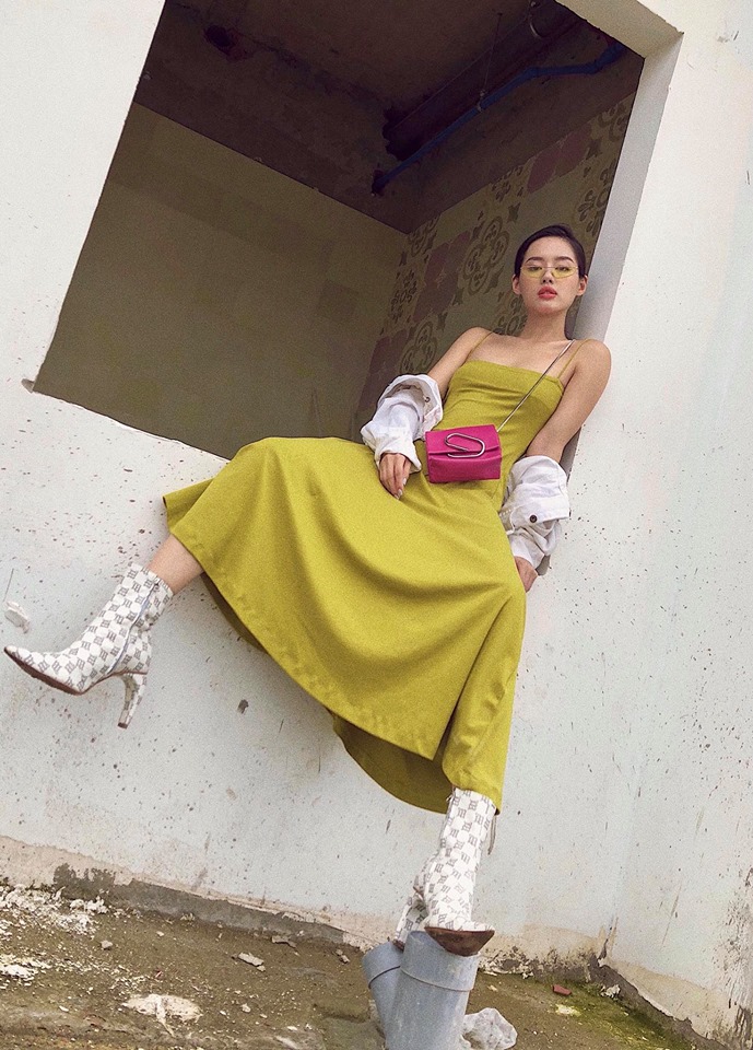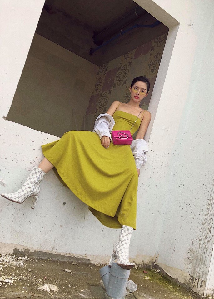 Vẻ lạnh lùng pha lẫn vẻ quyến rũ, gợi cảm. Người đẹp sinh năm 1995 nổi bật với set đồ thời thượng khi chọn màu vàng trendy kết hợp cùng boots nhọn họa tiết caro, nhấn nhá bằng túi xách mini màu hồng.