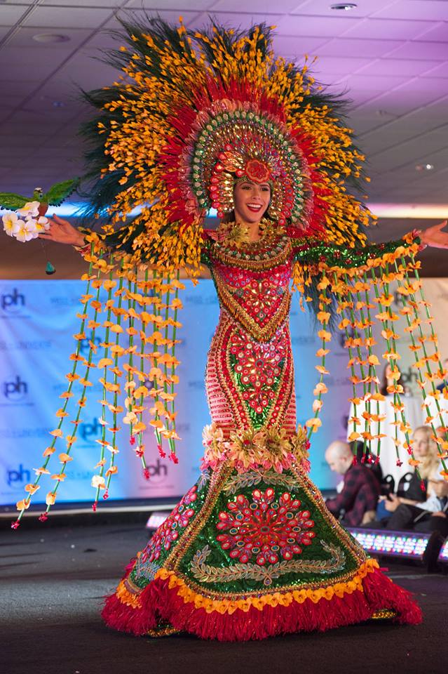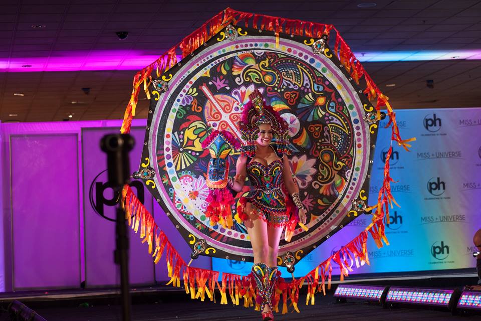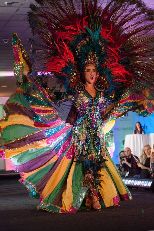 Hoa hậu Nicaragua vô cùng sặc sỡ trong bộ trang phục đầy màu sắc.Bộ trang phục gây ấn tượng với độ hoành tráng và kì công nhất nhì phần thi quốc phục. Nhìn người đẹp không khác gì một vị hoàng hậu quyền uy.