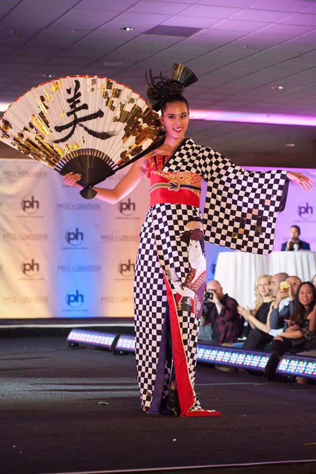 Nhật Bản đem tới một bộ quốc phục Kimono với họa tiết ca rô trắng-đen đẹp mắt, kết hợp cánh quạt xòe cùng chiếc thắt nơ ngộ nghĩnh.