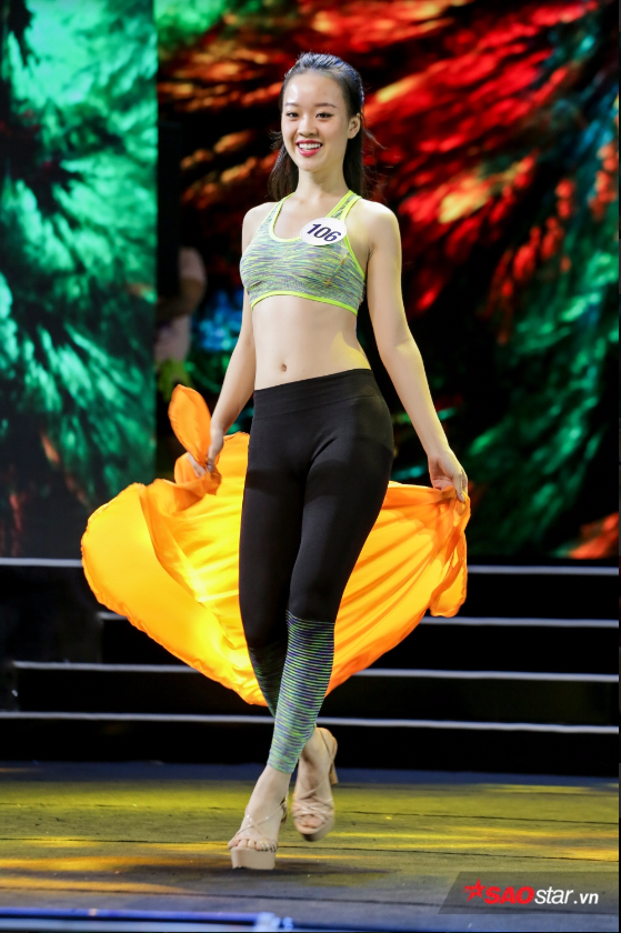 Từng bị chê về hình thể “lỏng lẻo”, nhưng lần này, Quán quân Vietnam's Next Top Model 2014 thật sự nổi bật với ngoại hình săn chắc, cân đối hơn lần trước. Trên sân khấu diễn tập, cô nổi bật hơn hẳn dàn thí sinh năm nay.