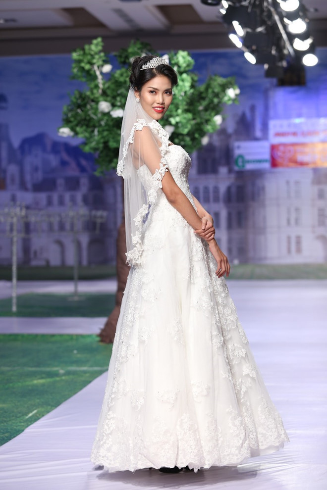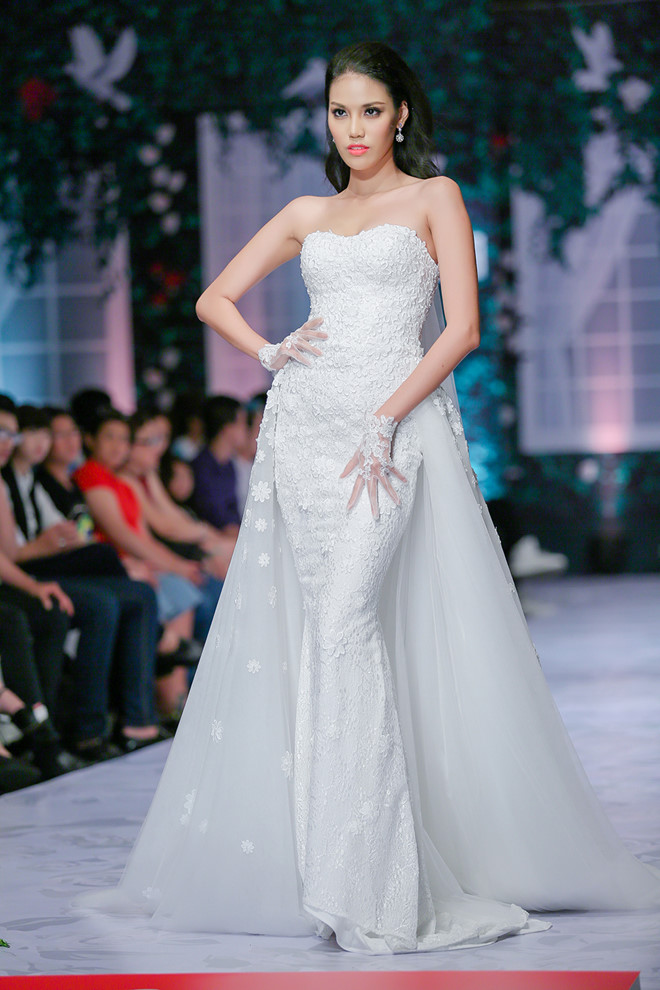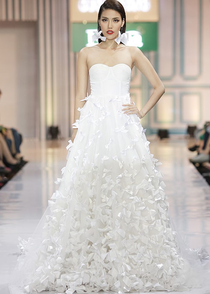 Top 11 cuộc thi Hoa hậu Thế giới 2015 thu hút mọi ánh nhìn từ thần thái đến những bước đi chắc chắn trong chiếc váy cưới trắng với phần chân váy đính kết nơ được thắt từ dây ruy băng.