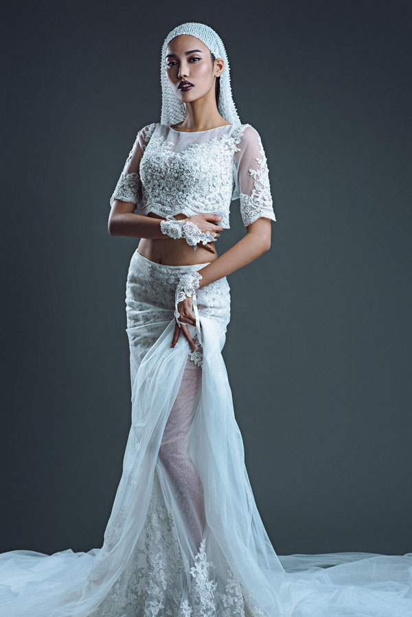 Mẫu váy cưới bằng chất liệu ren xuyên thấu được cách điệu từ trang phục nội y, kết hợp cùng băng-đô và khăn voan mang lại vẻ ma mị và quyến rũ khó cưỡng cho những cô dâu không ngần ngại phô diễn nét đẹp của cơ thể.