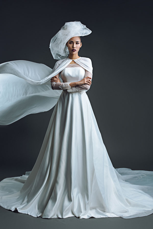 Đây là mẫu áo dài cưới cổ điển với một chút biến tấu cùng áo choàng dài mang lại vẻ quyền lực và khí chất cho chân dài.