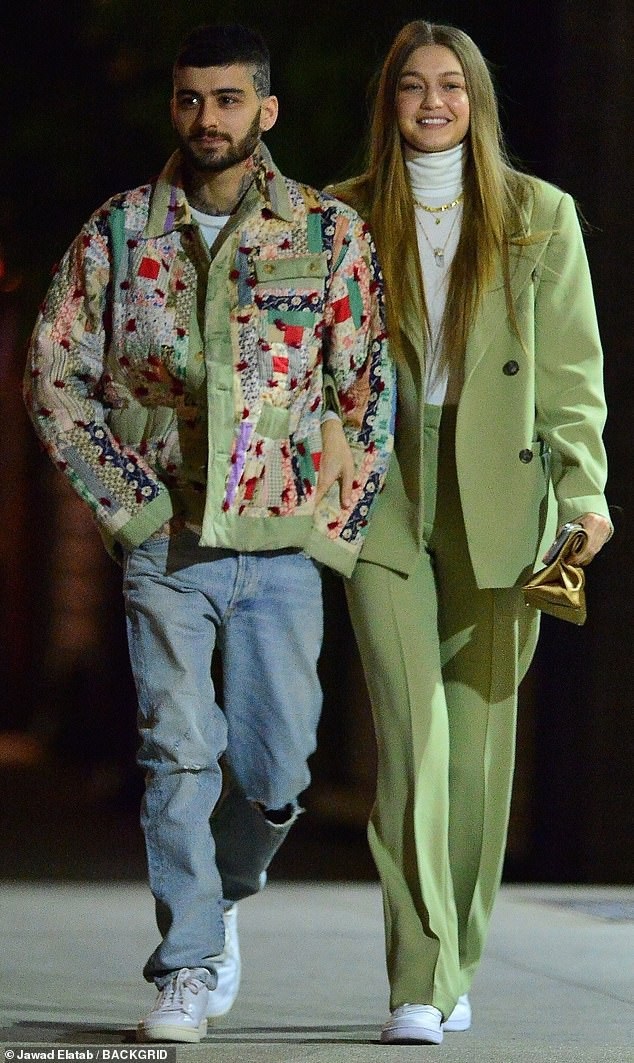Với gam màu xanh chuối nhạt, Gigi Hadid diện nguyên cây suit xanh lá chuối cùng áo cổ lọ trắng bên trong, chàng bạn trai đẹp trai ngút ngàn thì lại chon áo khoác họa tiết cùng viền áo hợp tông màu với bạn gái. Giày thể thao và giày bốt hầm hố thường xuyên được cả hai chọn mang khi đi cùng nhau