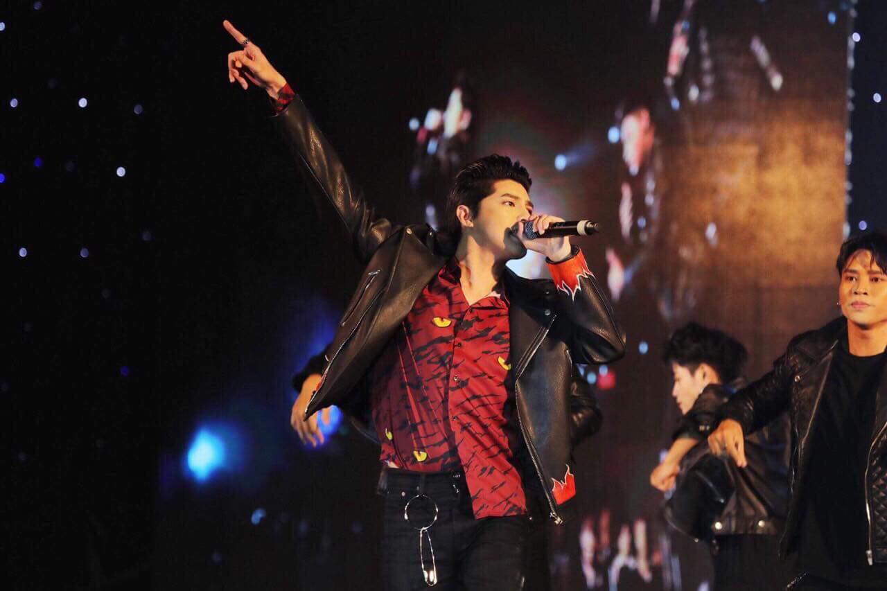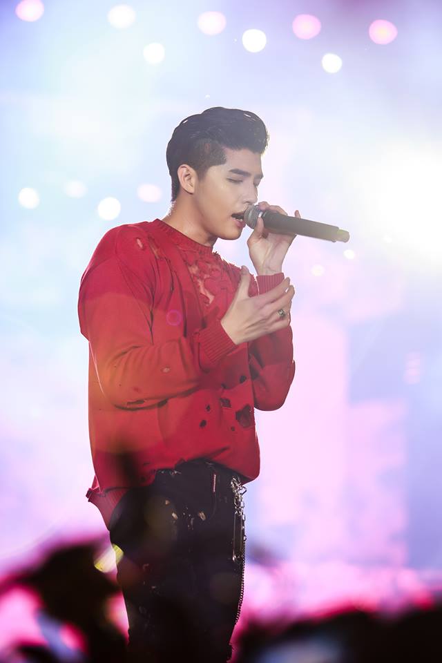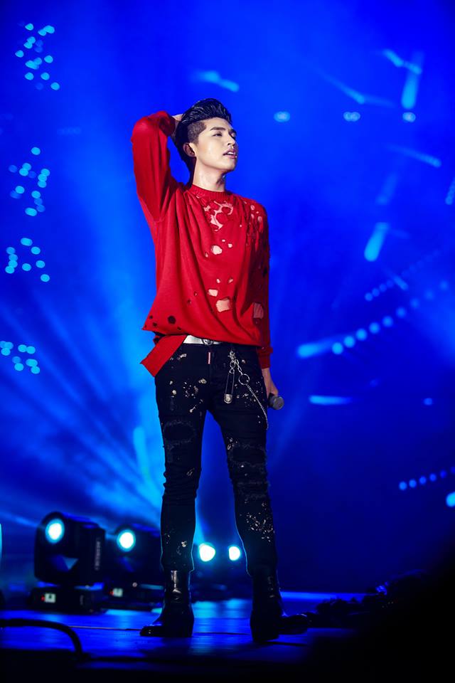 Trên sân khấu, anh chàng ưa chuộng các thiết kế nổi bật nhưng vẫn mạnh mẽ, đơn cử như áo hoodie đỏ cùng quần jeans đen.