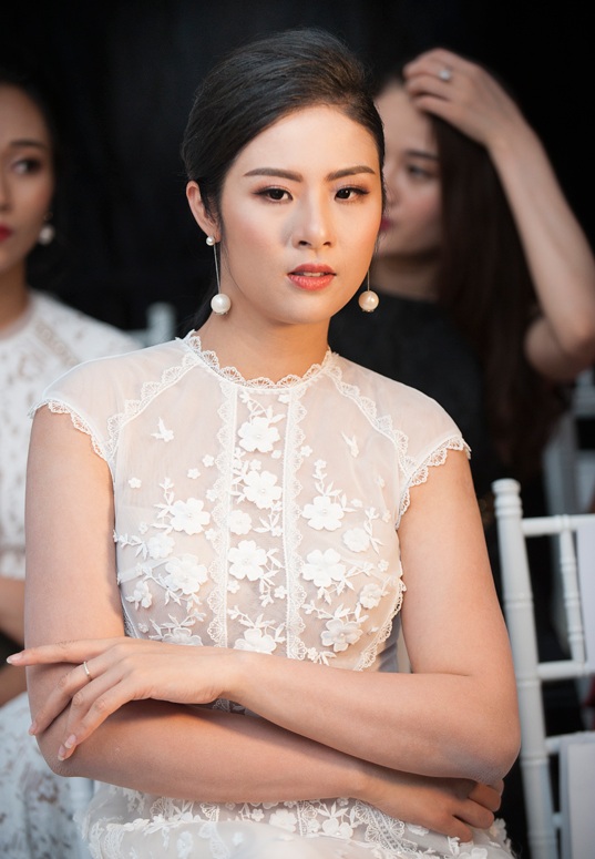 Hoa hậu Ngọc Hân cũng diện trang phục tone ren trắng đỡ thấy phần nội y bị lộ hơn đàn em