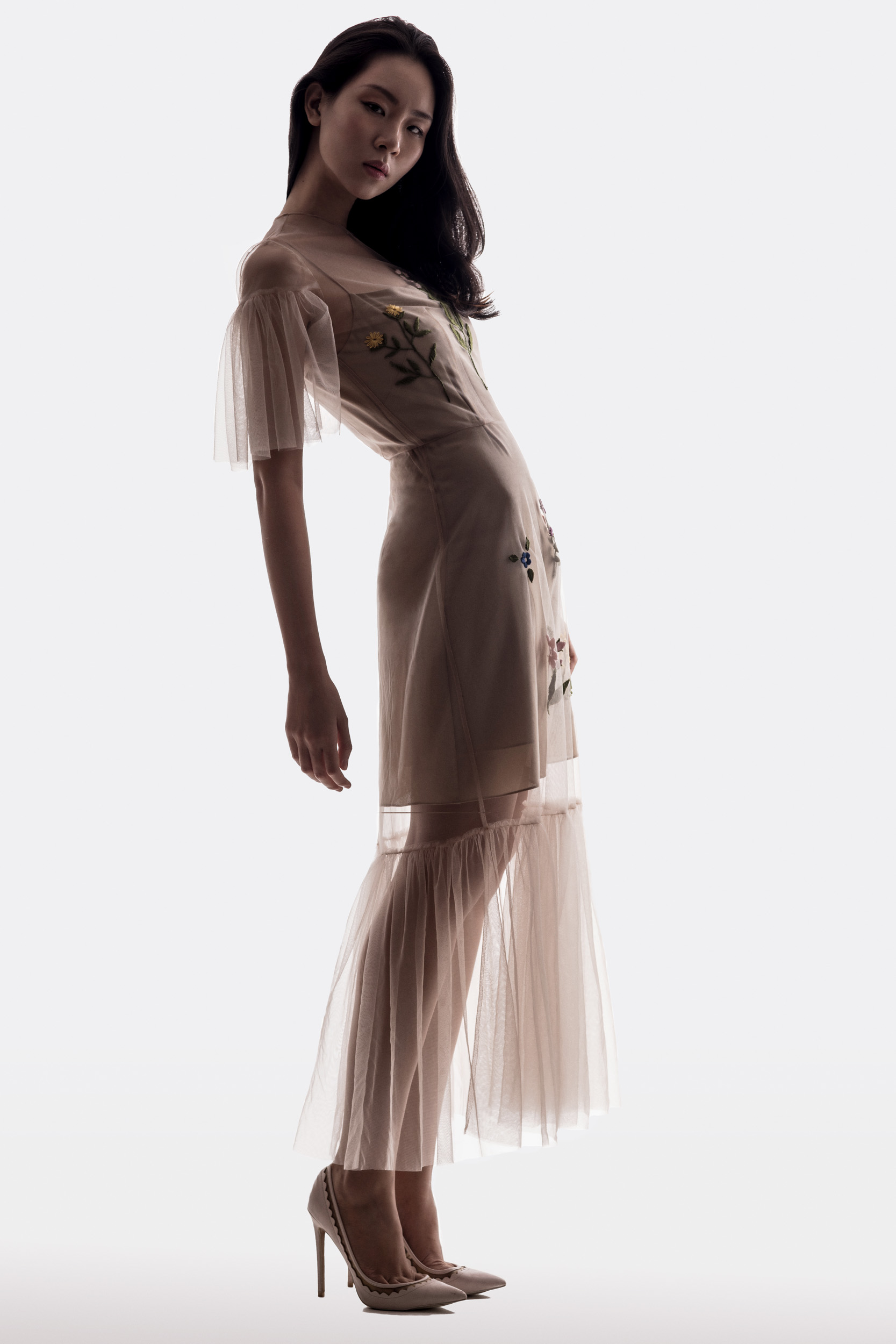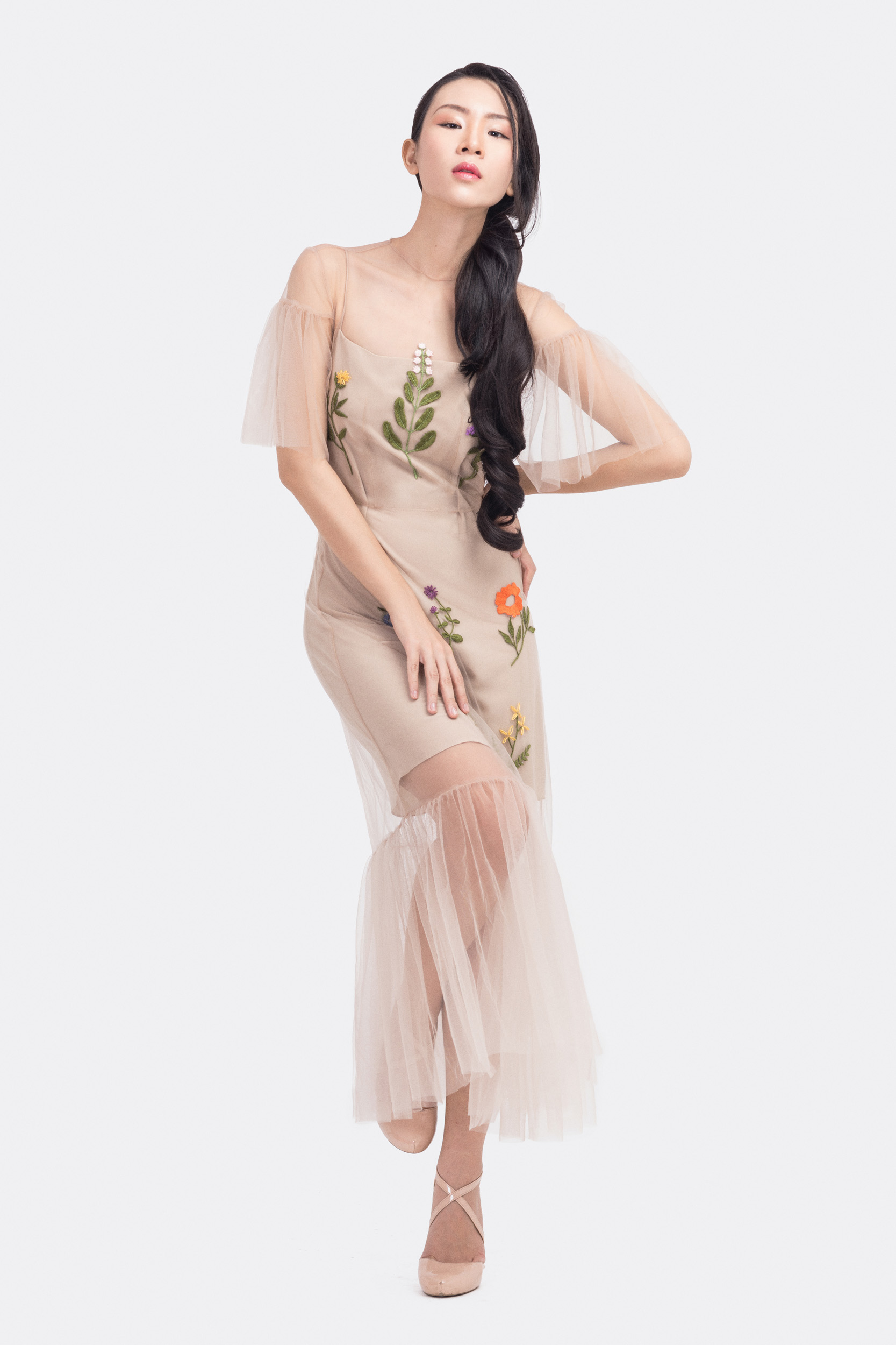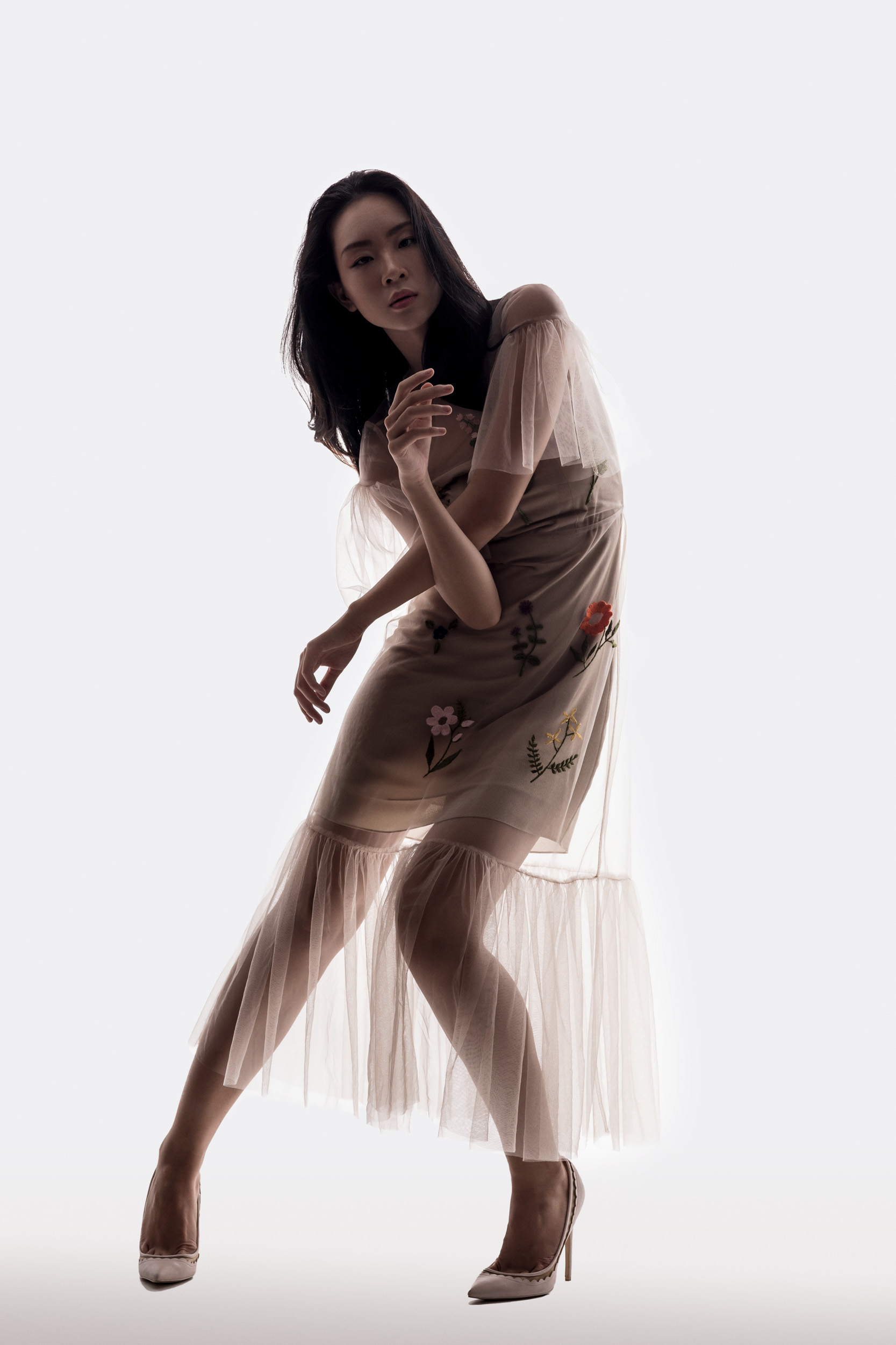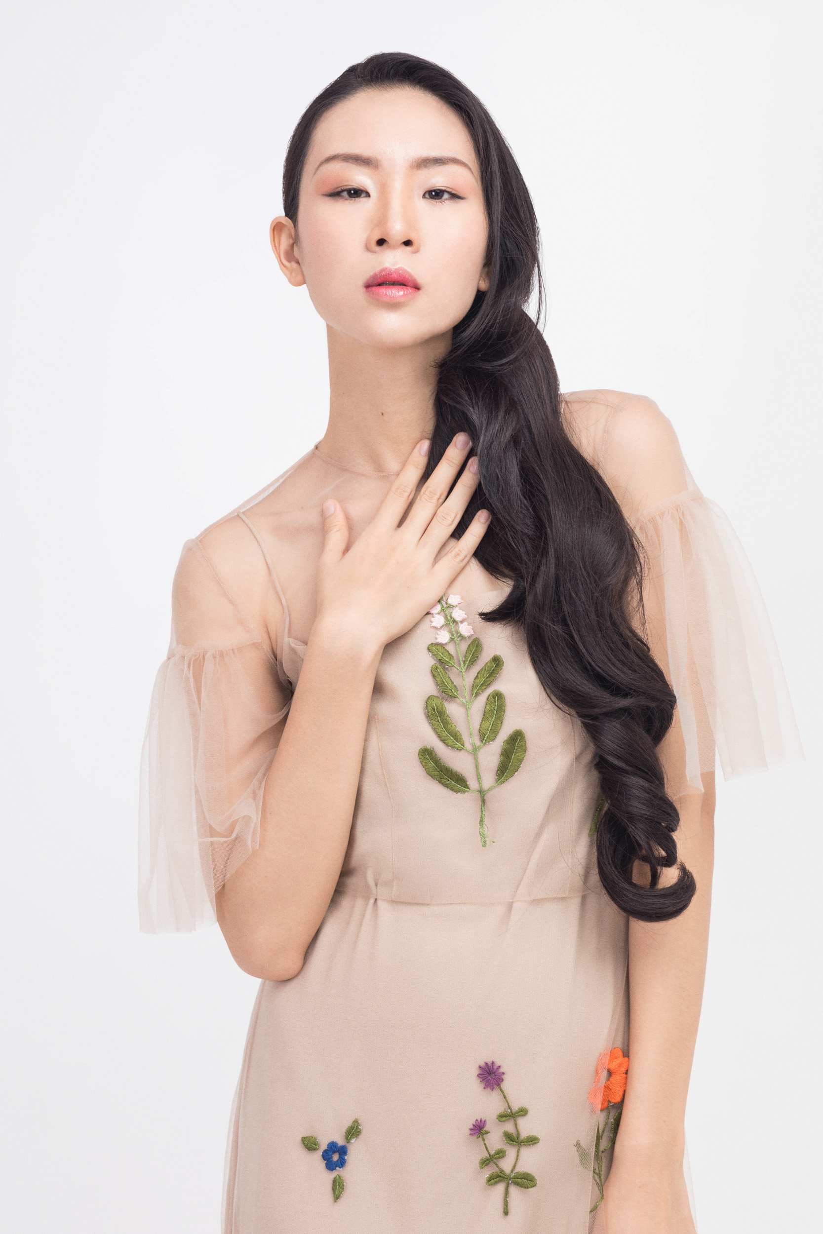 Trong shoot ảnh này, chân dài chọn bộ cánh với tông màu pastel nhẹ nhàng thêu đính hoa thanh nhã…