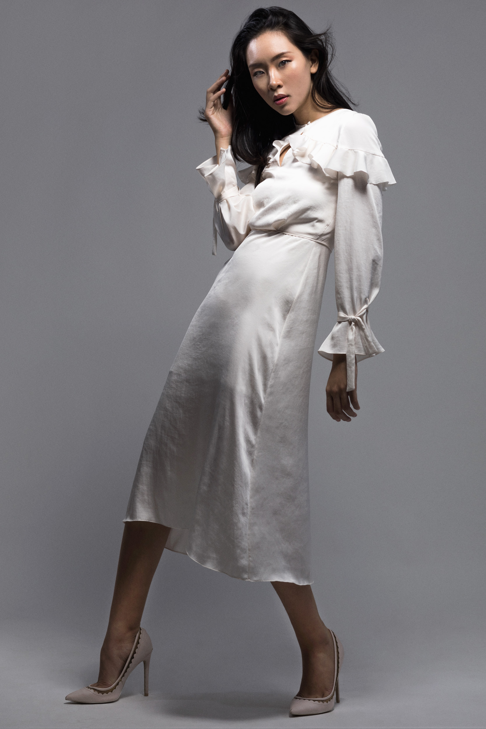 Hoặc chiếc váy màu trắng, mái tóc buông lơi đem lại vẻ đẹp rất thơ.