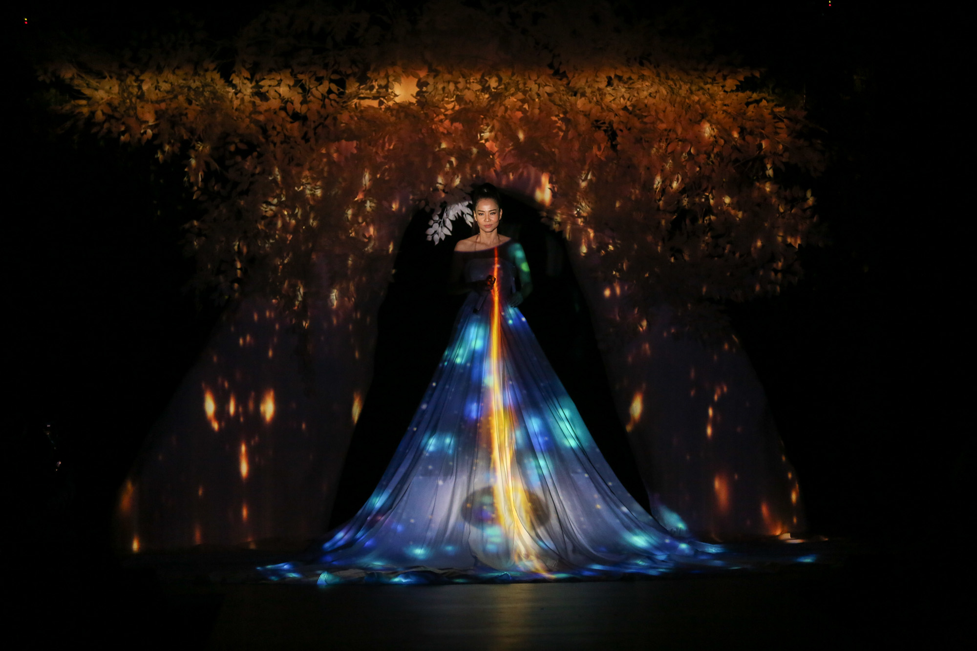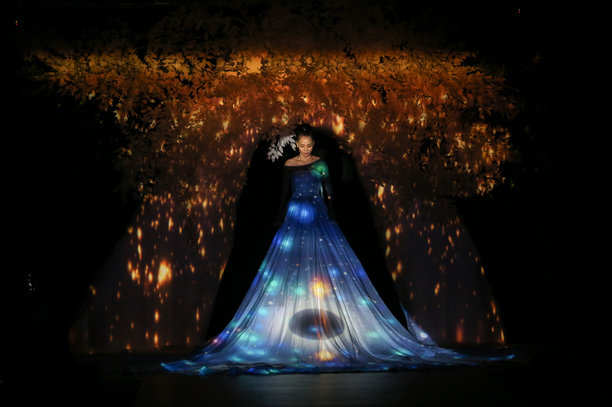 Kỹ thuật 3D Mapping hiện đại đã được sử dụng để tạo hiệu ứng thị giác trên chiếc đầm trắng mà nữ ca sĩ khoác lên người.