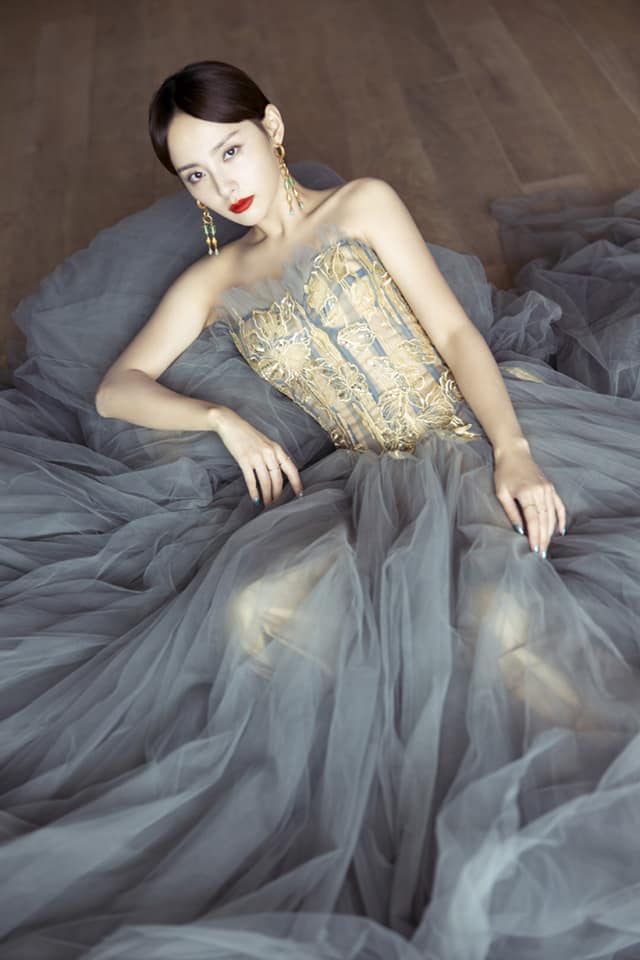 Làn da trắng không tì vết của Trương Gia Nghê tạo dáng trong kiểu váy cúp ngực bung xòe mang hơi hướng style công chúa Phương Tây