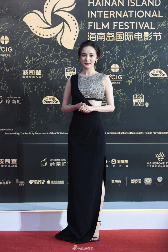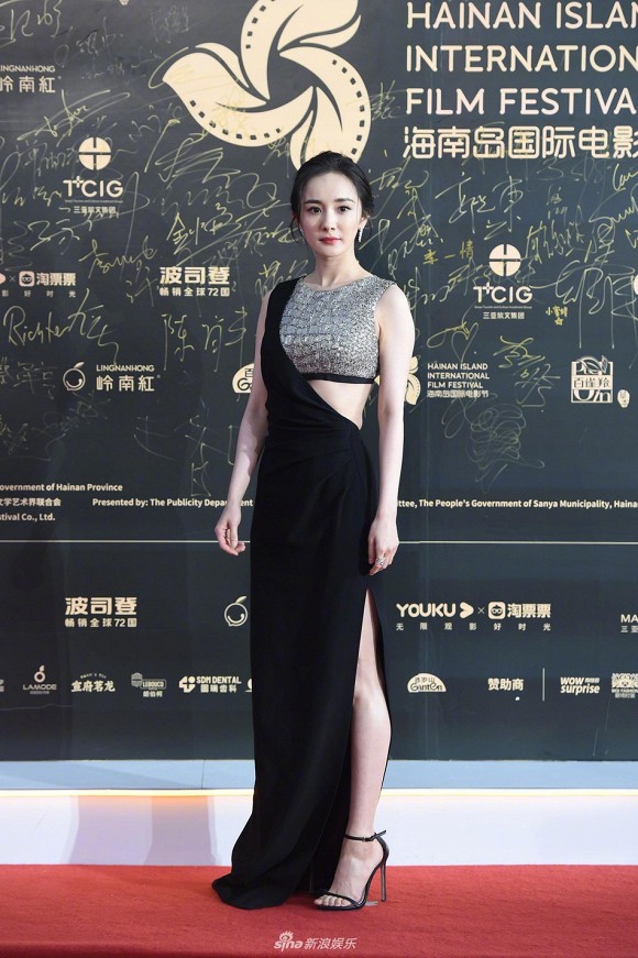 Dương Mịch trong kiểu váy cut-out mà đen, kiểu áo croptop màu bạc gắn liền với bộ váy khoe được phần eo thon và chân dài của cô trên thảm đỏ