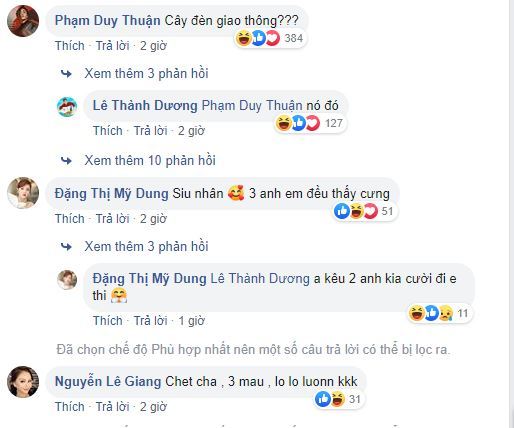 Còn Lê Giang còn bày tỏ: “Ba màu à, nhìn lo lắm”; hay diễn viên Midu: “Ba anh em siêu nhân nhìn đã thấy cưng”.