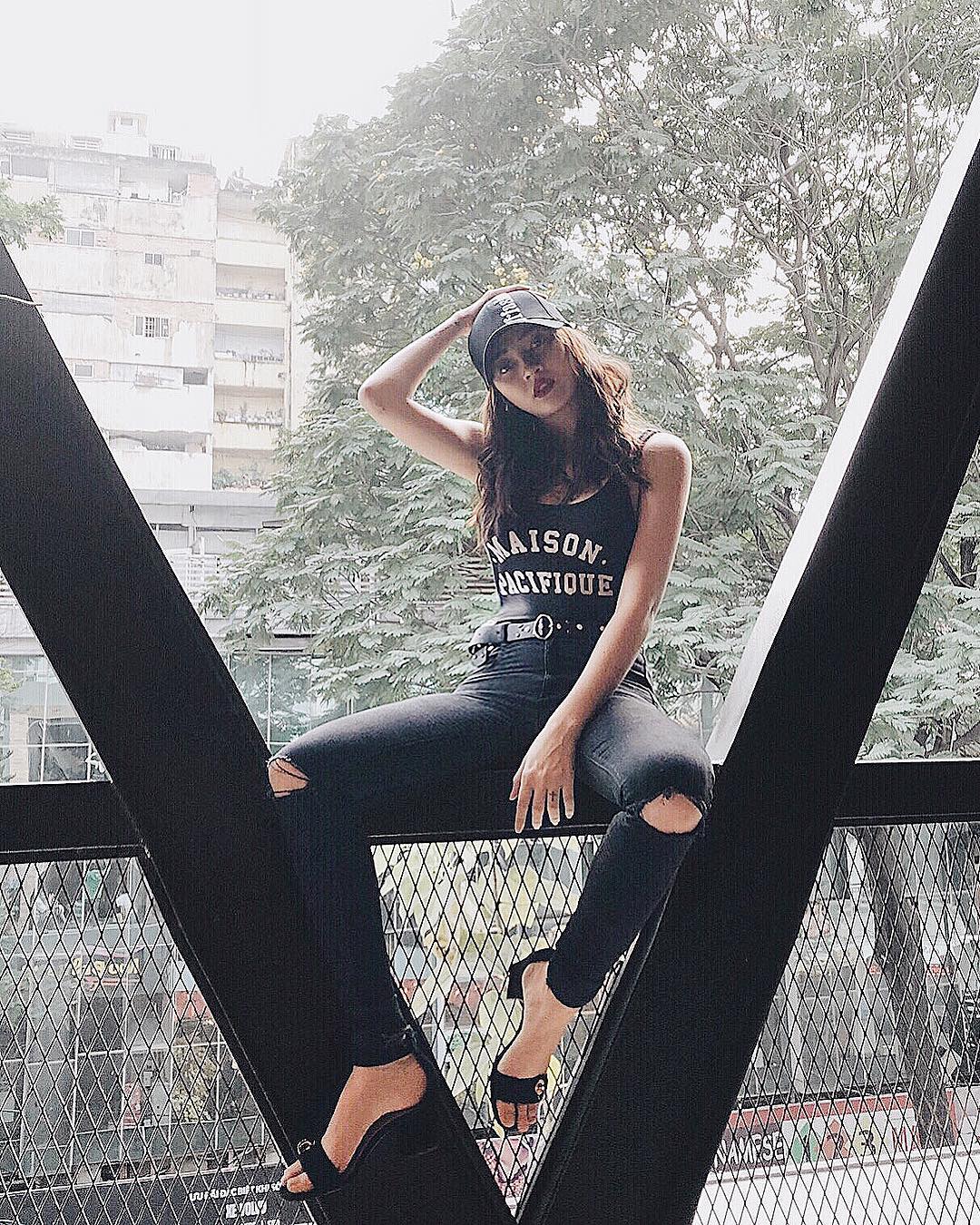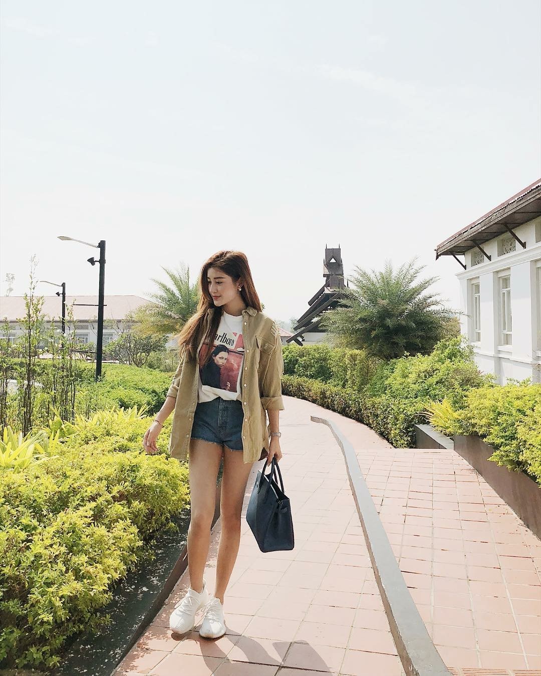 Huyền My diện set đồ đơn giản với flannels khoác ngoài màu be cùng áo thun và quần short năng động. Trong dịp lễ valentine lần này, Huyền My trở nên trẻ trung và tươi tắn hơn trong set đồ street style thoải mái.