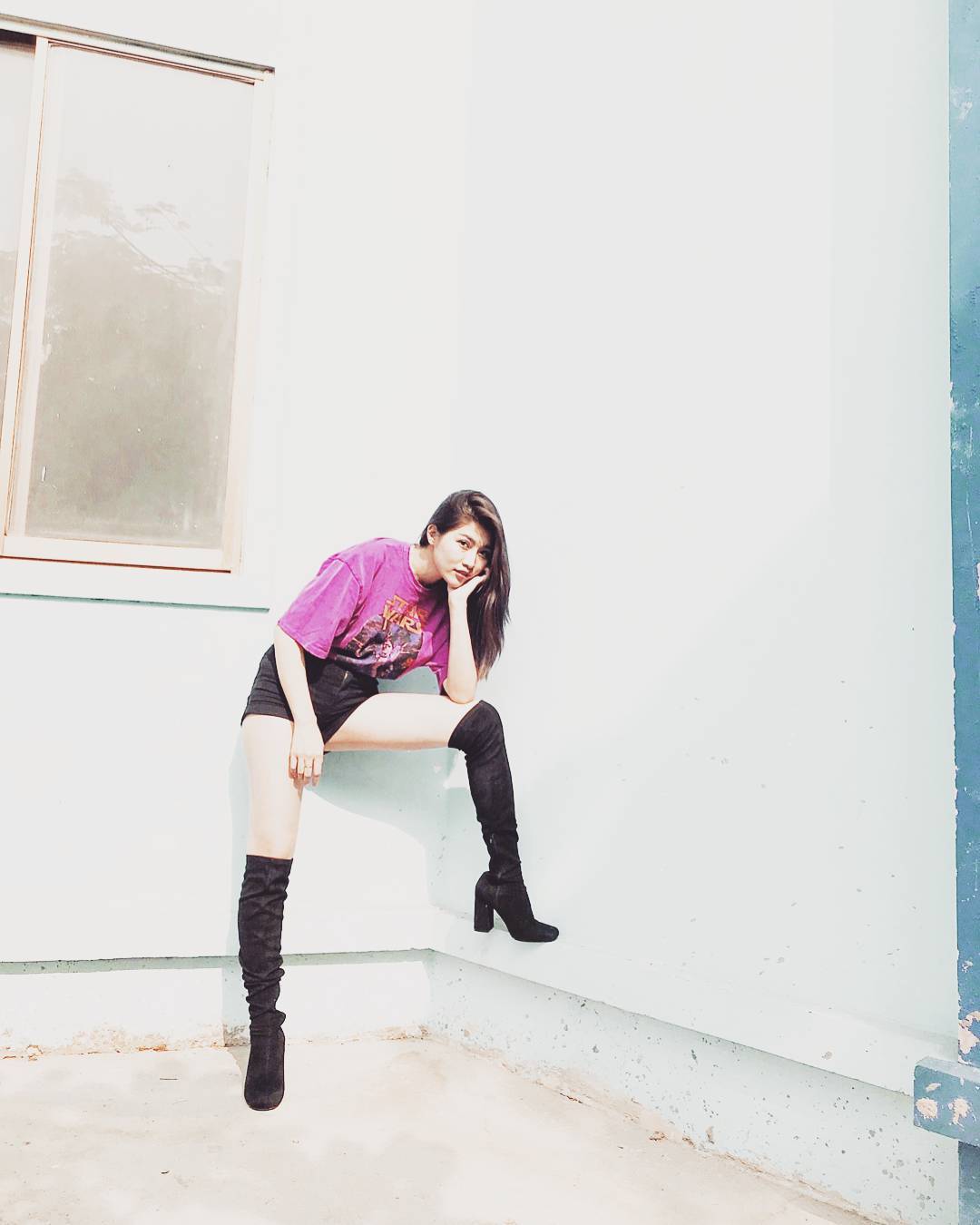 Chế Nguyễn Quỳnh Châu khoe đôi boot quá gối ton sur ton với quần short. Nàng mẫu không quên diện áo thun màu hồng điệu đà cho phù hợp với không khí valentine.