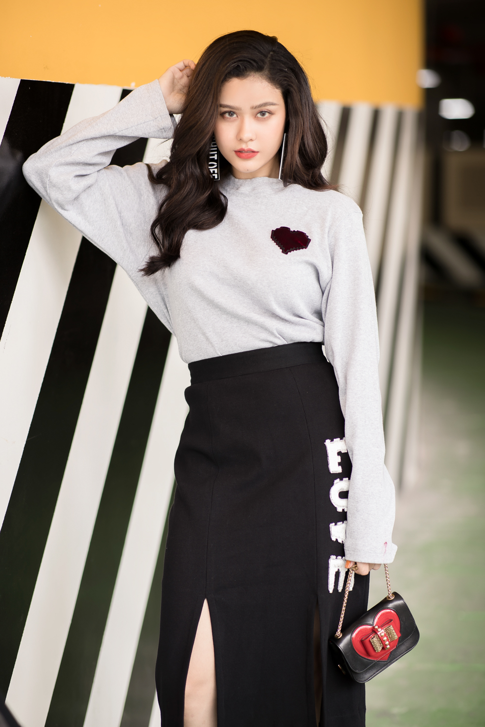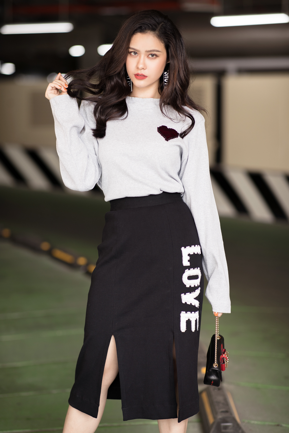 Trương Quỳnh Anh biết cách kheo khéo đôi chân trong mẫu váy xẻ tà thêu chữ L.O.V.E tương phản màu sắc.