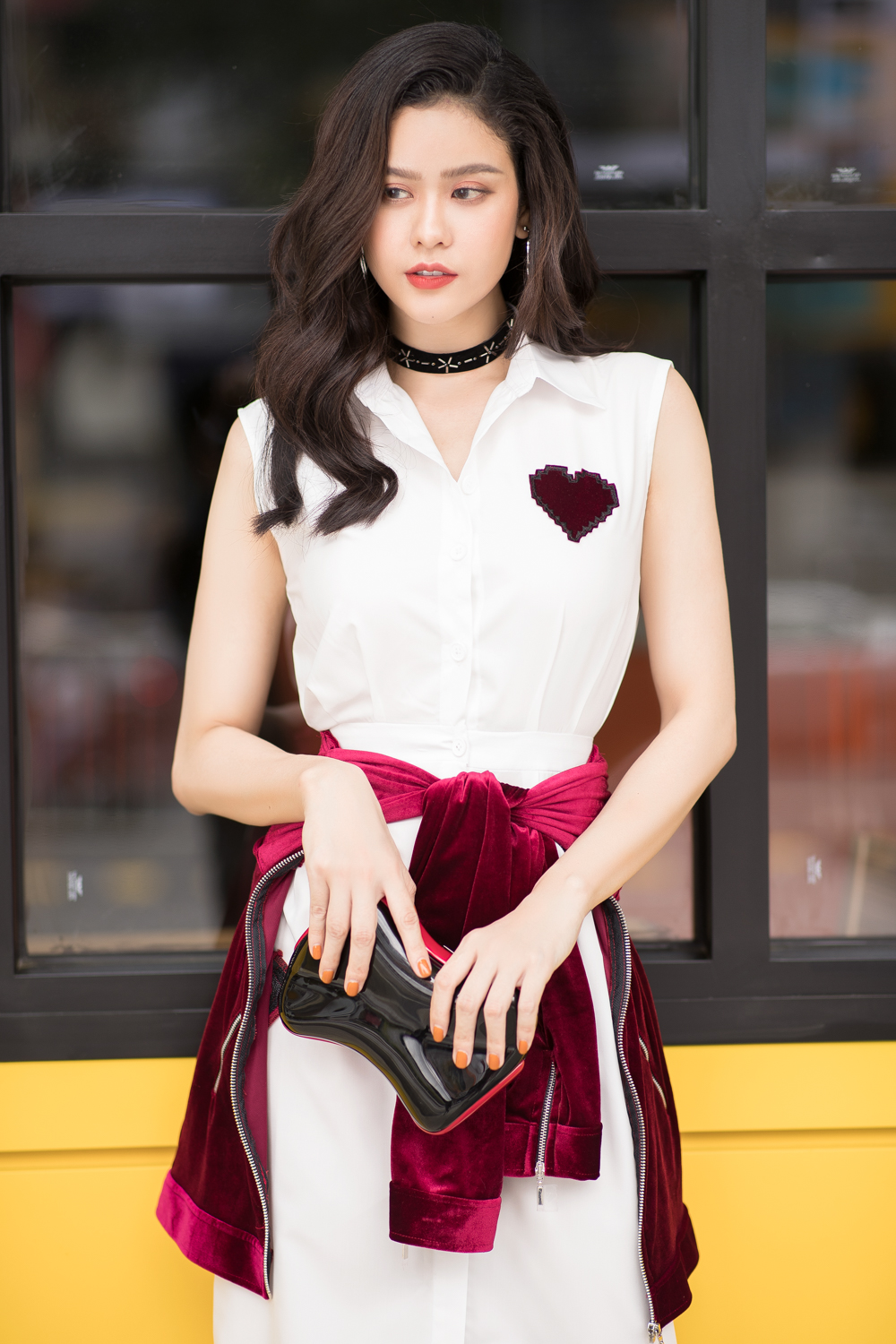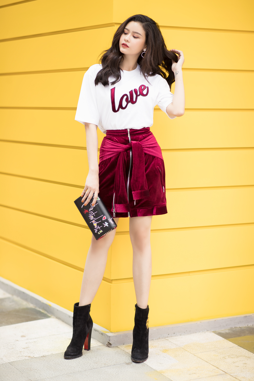 Đôi boots cá tính và chiếc clutch của Christian Louboutin với họa tiết trái tim khiến bộ trang phục cá tính và thu hút hơn rất nhiều.