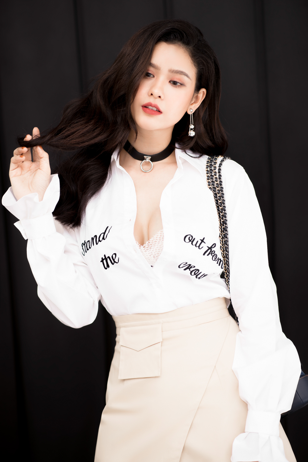 Người đẹp sành điệu, gợi cảm trong mẫu áo sơ mi thêu slogan với cúc áo được buông hờ hững.