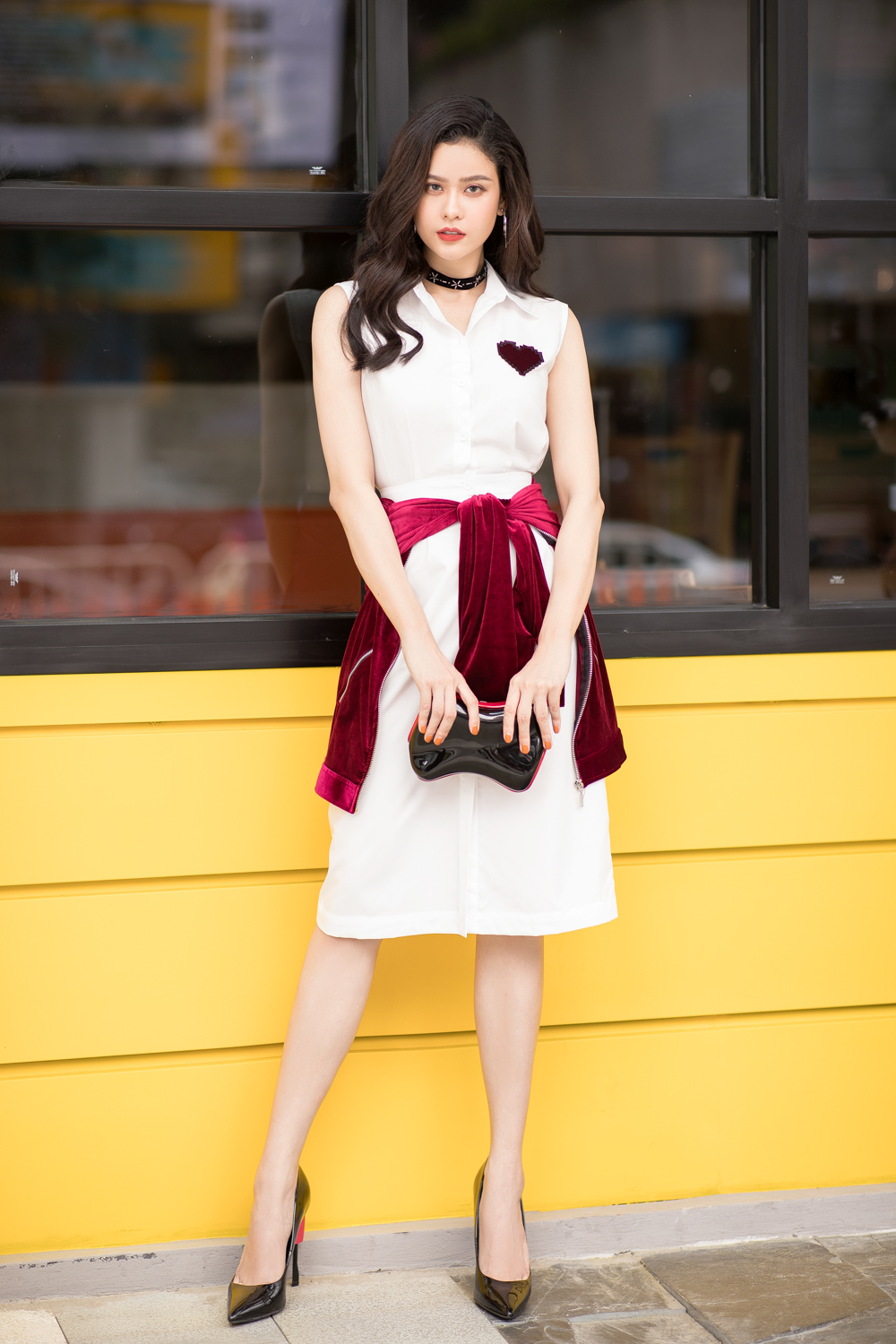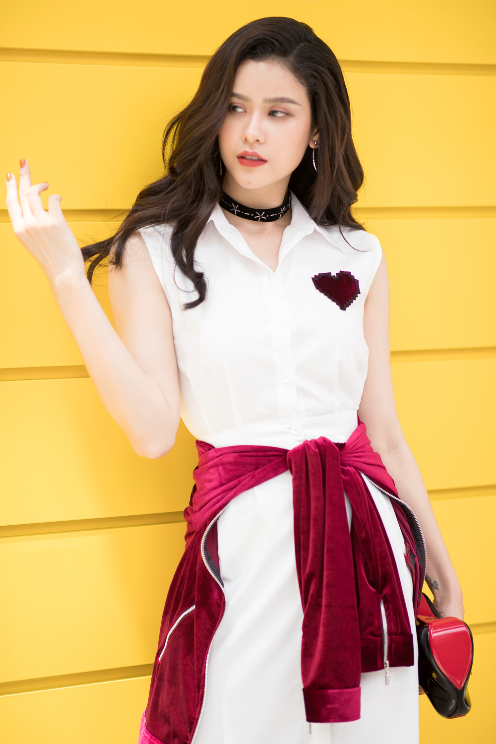 Cô khéo léo buộc vạt chiếc chân váy nhung đỏ, nhằm tạo vẻ thon gọn và nổi bật cho vòng eo.
