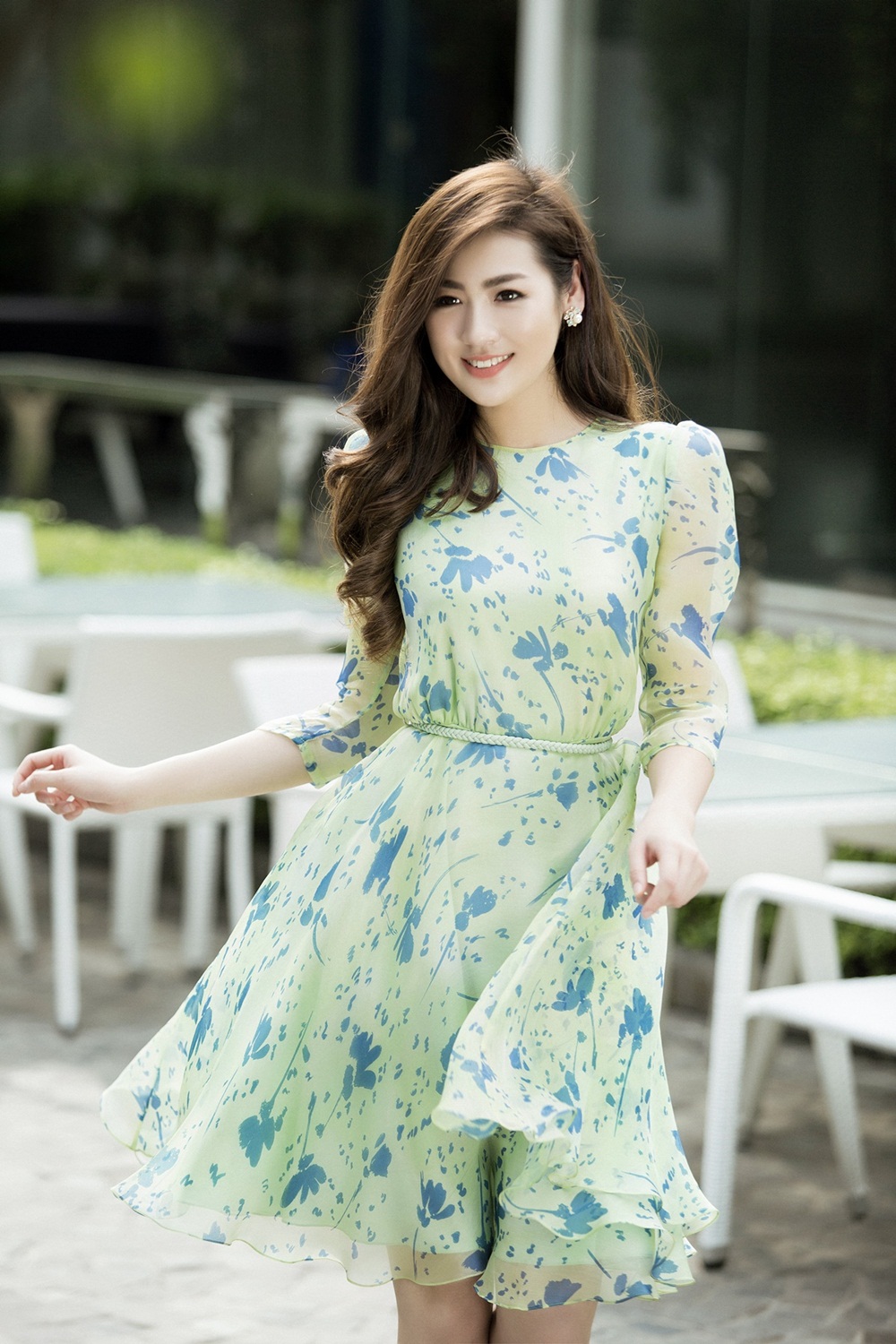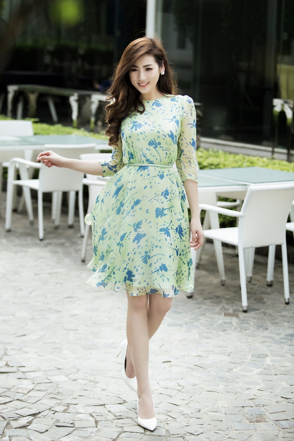 Chiếc đầm xòe màu xanh lá cây nhạt cực kỳ hợp với những lần dạo phố.