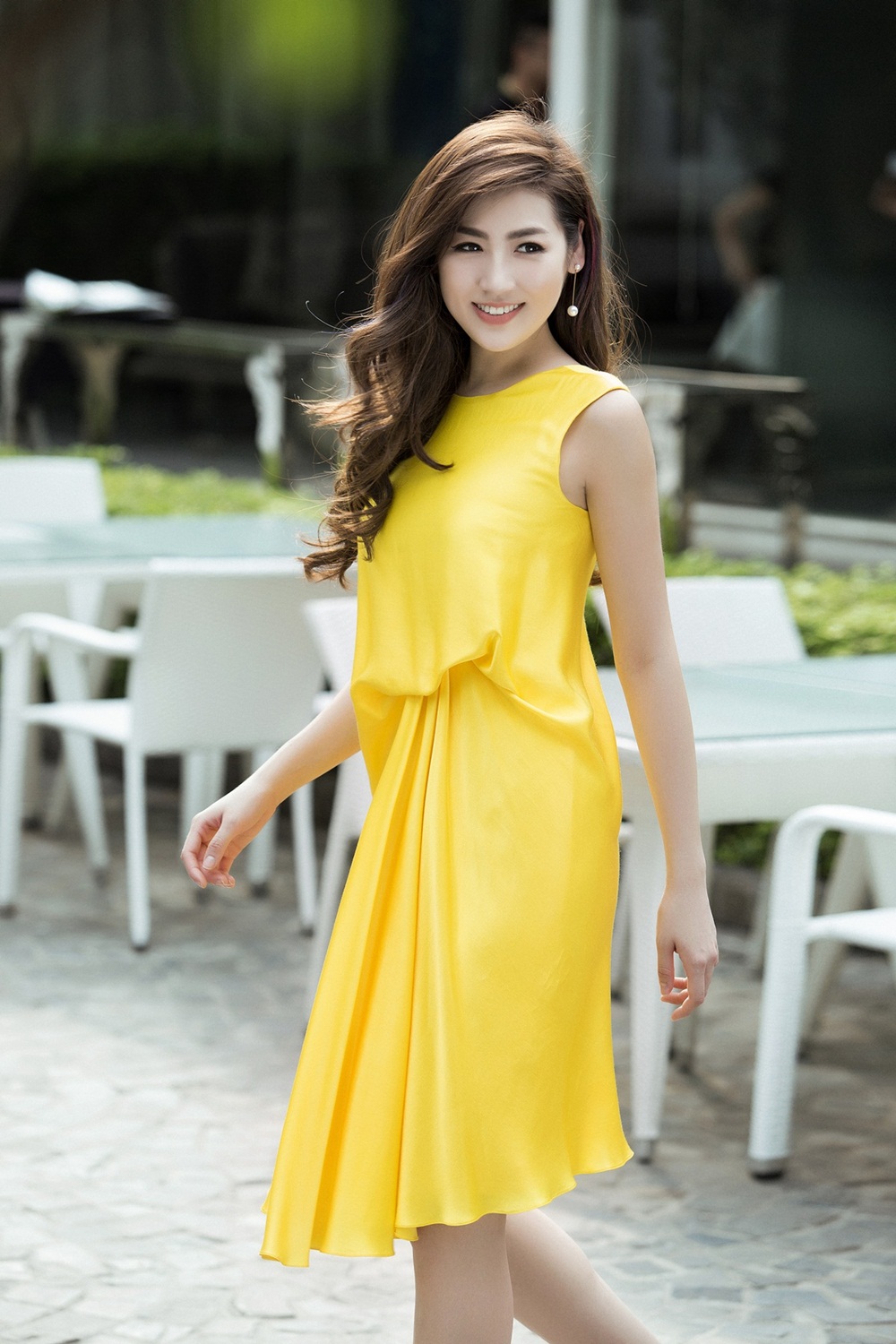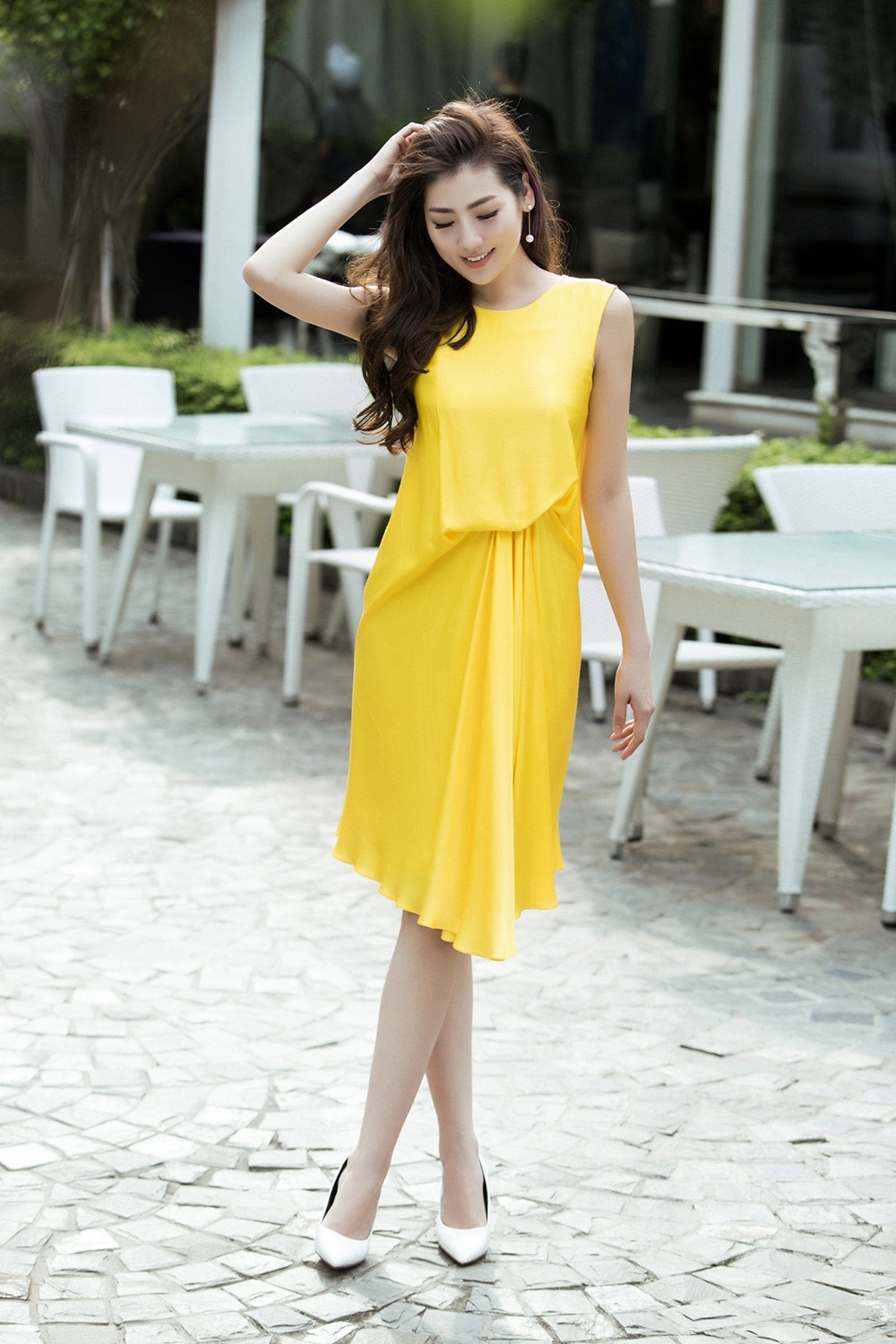 Cùng chất liệu nhưng với màu vàng chanh bắt mắt, Tú Anh dễ dàng trở thành tâm điểm thu hút mọi ánh nhìn trên phố.