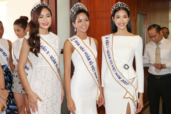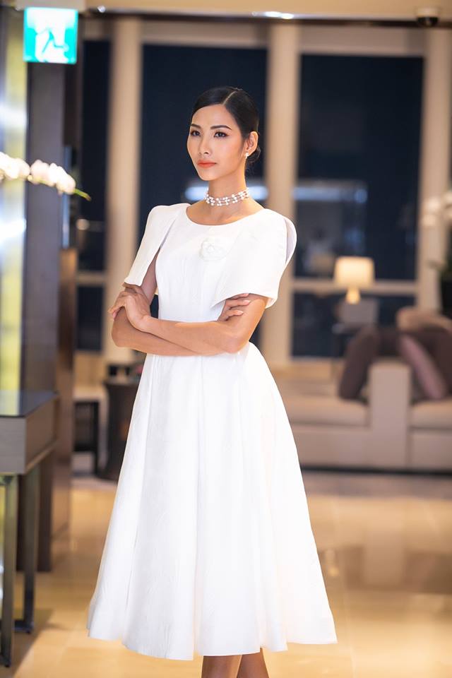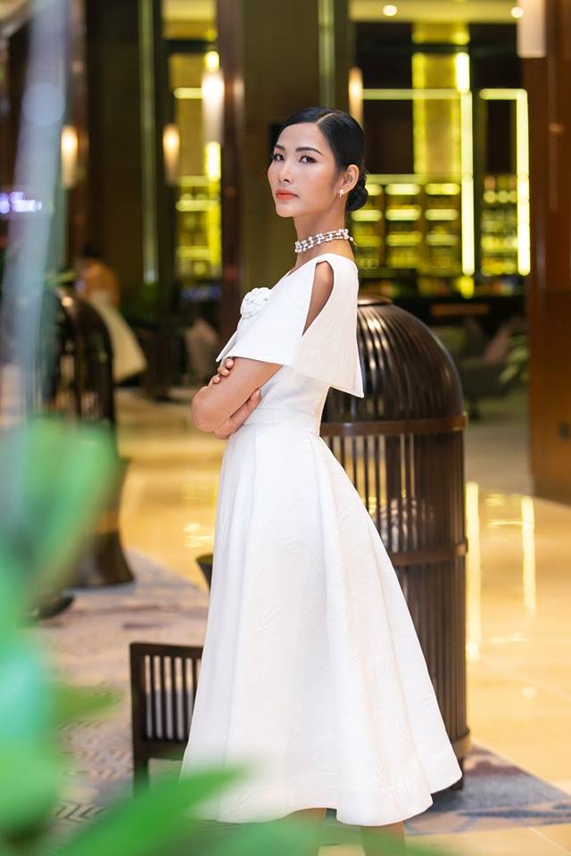 Sau đăng quang, sắc trắng được Hoa hậu H”Hen Niê diện với tần suất “chóng mặt” và ngày càng được công chúng đánh giá cao. Nhưng về phía nàng Á hậu 1, cô chỉ mới phát huy loại sắc phục này thường xuyên hơn trong thời gian gần đây. Tại sự kiện diễn ra hôm 27/7, người đẹp họ Hoàng ghi điểm với diện mạo sang trọng nhưng không kém phần nóng bỏng trong thiết kế lệch vai gợi cảm.