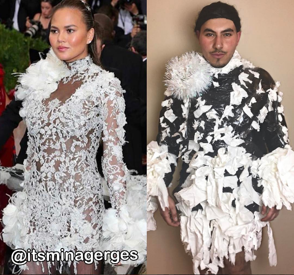Trong khi siêu mẫu áo tắm Chrissy Teigen bay bổng, nhẹ nhàng với váy bó xuyên thấu như nàng thiên nga thì nhìn qua Mina Gerges chẳng khác gì… “chú quạ khăn giấy”. Thật lòng mà nói, sức sáng tạo của anh chàng đôi khi vượt đến ngưỡng không ngờ.