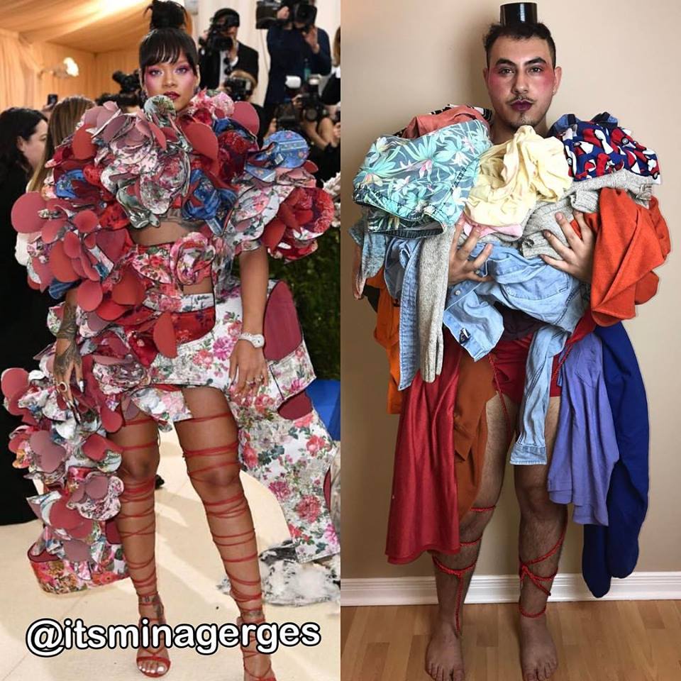 Mina Gerges dường như bối rối đến mức “phá banh” bộ váy Comme des Garçons đúng chất “bà hoàng hoa hòe” của Rihanna thành mớ hỗn độn thế này. Có thể thấy anh chàng luôn đặt “tâm huyết” từ tóc, make up, đôi sandals chằng chịt đến cả thần thái lạnh lùng.