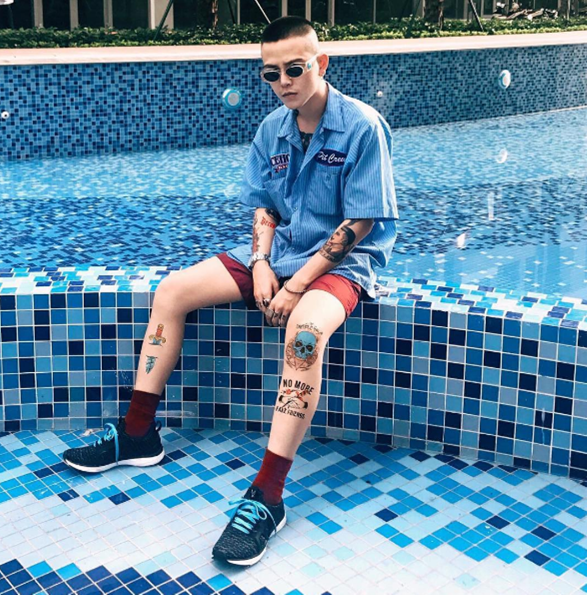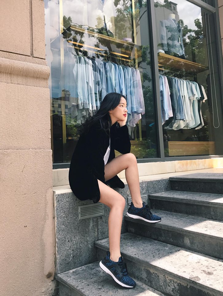Châu Bùi cực cá tính khi phối short với Biti’s Hunter X, phiên bản phối màu xanh biển.