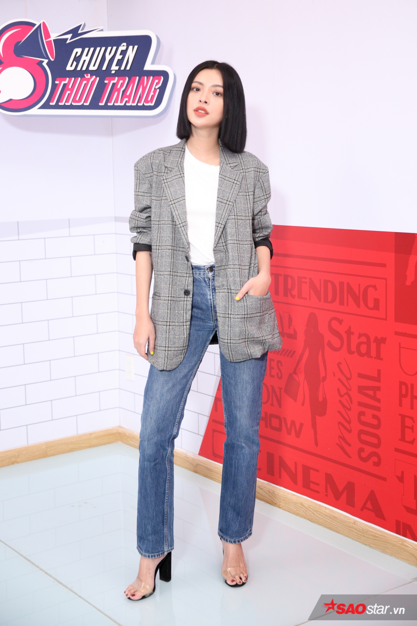 Với tarng phục công sở, Tú Hảo sử dụng một chiếc quần jeans mix cùng áo phông trắng và blazer khoác ngoài.